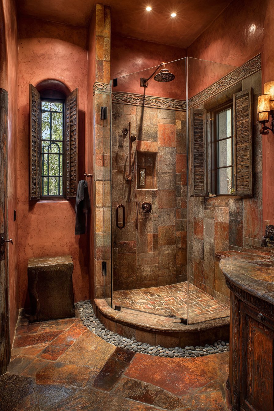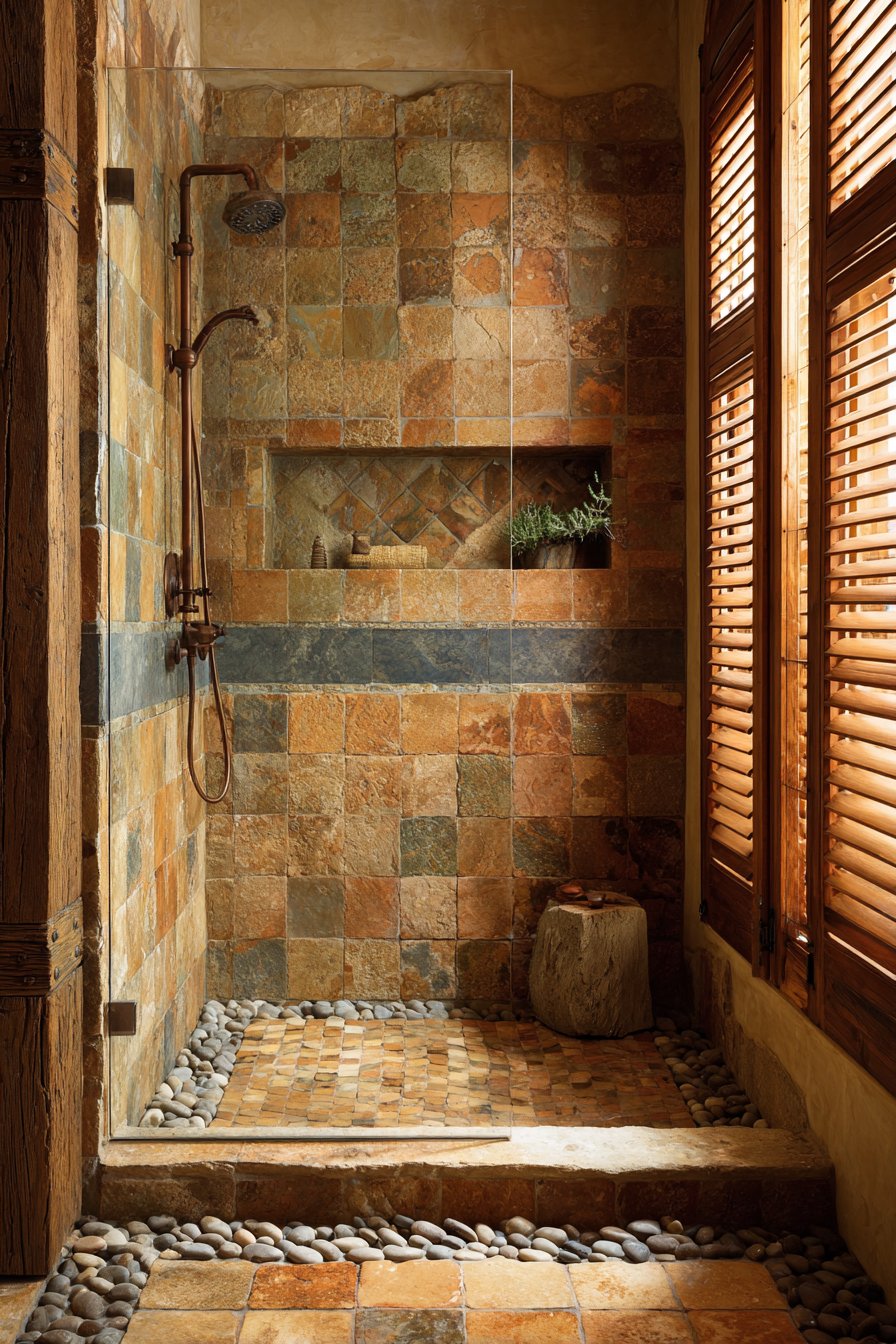 Important implementation considerations include: selecting terracotta tiles with appropriate water absorption ratings for shower applications, as some terracotta formulations are too porous for wet areas, sealing terracotta tiles with high-quality penetrating sealers that enhance color while providing water and stain resistance, ensuring copper fixtures receive protective clear coating to slow (though not stop) patina development if the owner prefers to maintain brighter copper appearance, properly waterproofing behind all tile installations to prevent moisture damage to structural walls, and treating wooden shutters with marine-grade finishes suitable for consistent moisture exposure. The river rock border requires professional installation to ensure proper setting and prevent individual rocks from becoming dislodged over time. This rustic shower idea celebrates warmth, color, and the enduring appeal of Mediterranean design traditions.