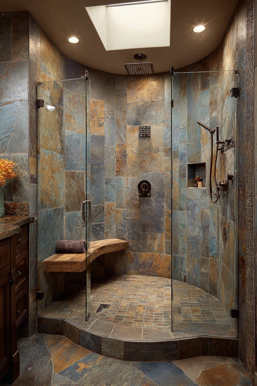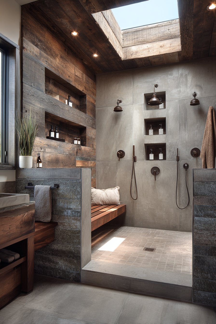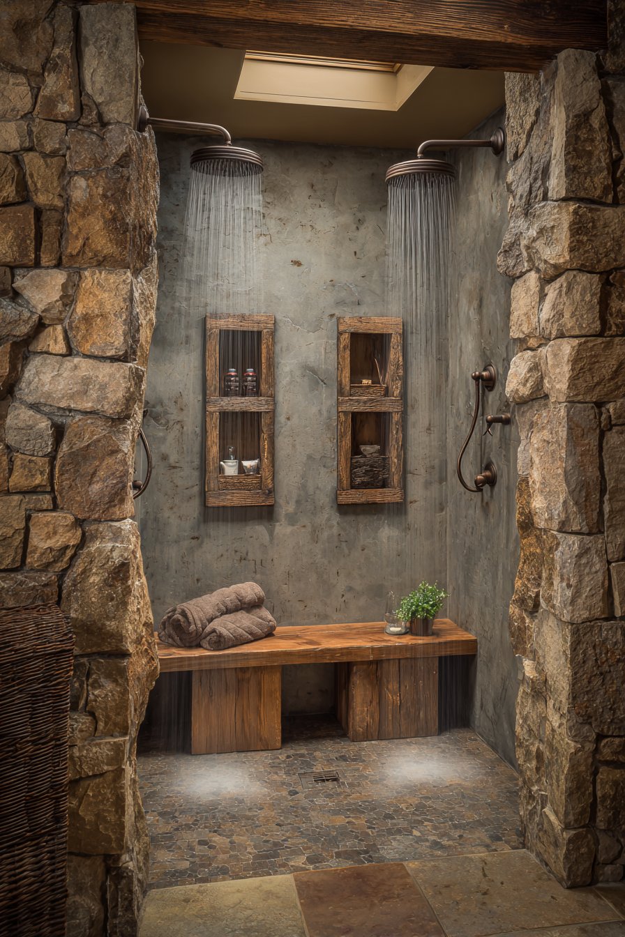 Essential design elements include: ensuring adequate water pressure and flow rate to supply both showerheads simultaneously without performance degradation, installing proper support structure for the floating teak bench capable of safely supporting multiple adults, treating teak bench with teak oil regularly to maintain its rich color and prevent graying, ensuring skylight installation includes proper flashing and waterproofing to prevent leaks into the shower space below, and creating recessed niches during initial framing and waterproofing rather than attempting to retrofit into completed walls. The stone feature wall requires professional installation by masons experienced with large, irregular stone pieces to ensure structural stability and proper waterproofing. This rustic shower idea demonstrates how rustic design can embrace luxury and spaciousness while maintaining connection to natural materials and honest craftsmanship.