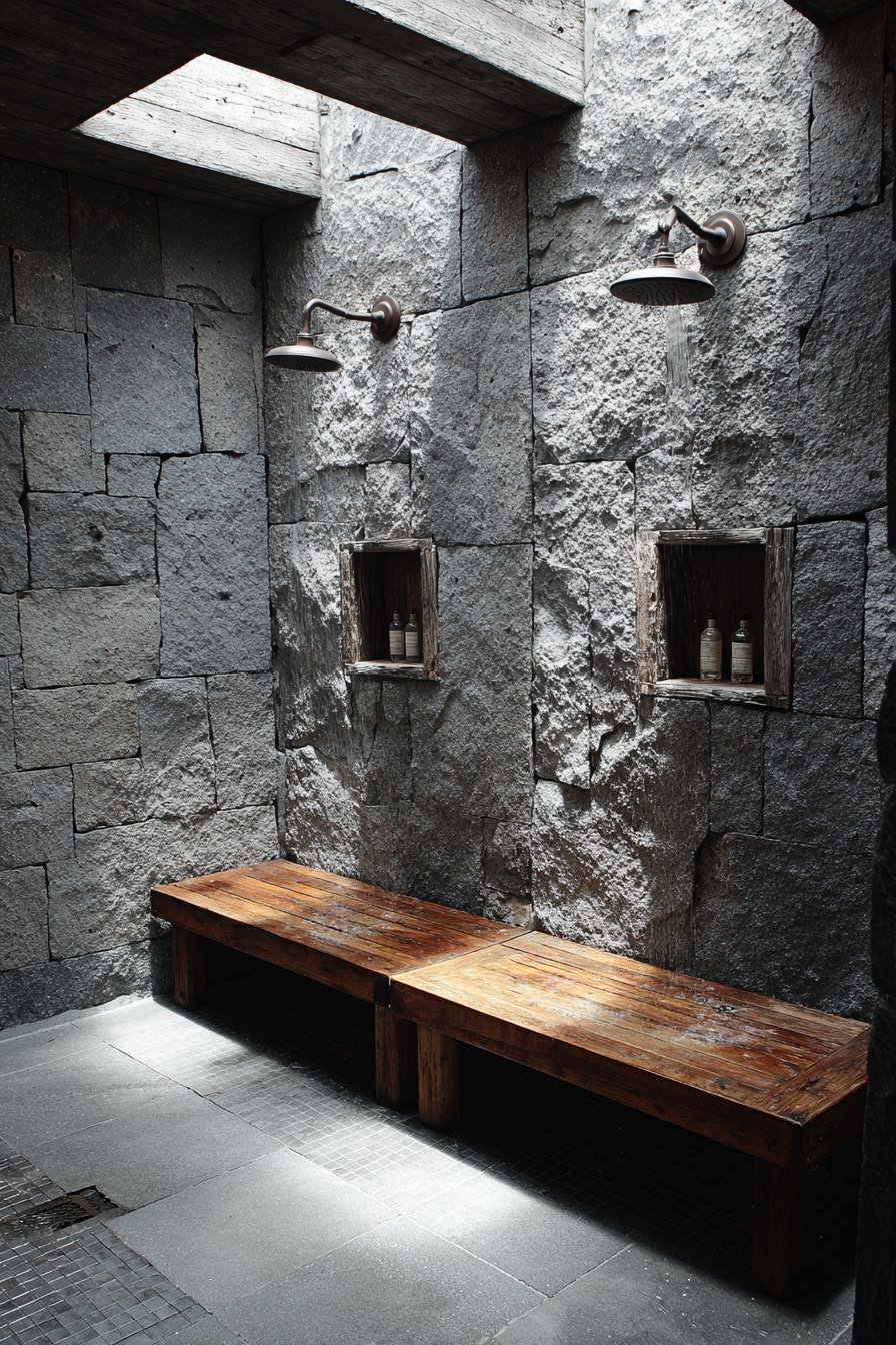 A floating teak bench spans between the two shower zones, its rich golden-brown tone adding warmth while providing practical seating that doesn’t impede the open flow between zones. The bench’s floating installation creates visual lightness despite its substantial appearance, while the teak’s natural oil content makes it ideal for wet environments. Reclaimed wood niche boxes set directly into the stone feature wall provide dedicated storage for each shower zone, their rustic character integrating seamlessly with the stone while creating functional organization. Natural overhead skylight floods the space with daylight, the changing angle and quality of sunlight throughout the day creating an ever-evolving interplay of light across the textured stone surface.