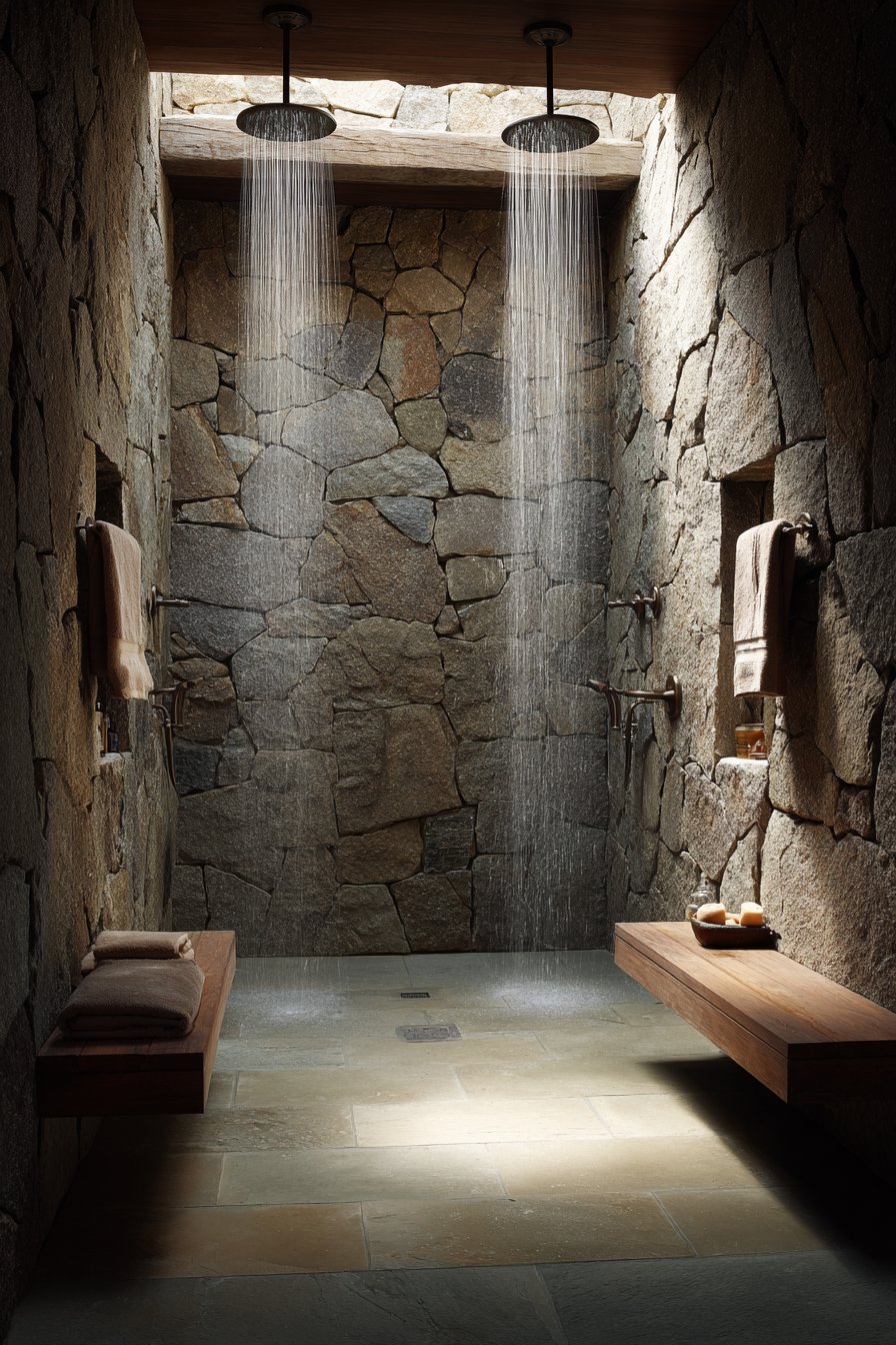 Spacious luxury defines this rustic shower idea featuring dual rainfall showerheads mounted on a rough-cut stone feature wall that serves as the space’s dramatic focal point. The stone wall showcases bold, irregular stone pieces in varied earth tones, each displaying natural texture and color variation that creates a powerful visual statement. The dual showerheads, finished in oil-rubbed bronze, position on this textured backdrop to create both functional zones and sculptural interest, their warm metallic finish complementing the stone’s warmer tones. Surrounding walls feature large-format tiles in concrete gray, their cooler neutral tone and smoother texture providing essential contrast to the feature wall’s dramatic texture.
