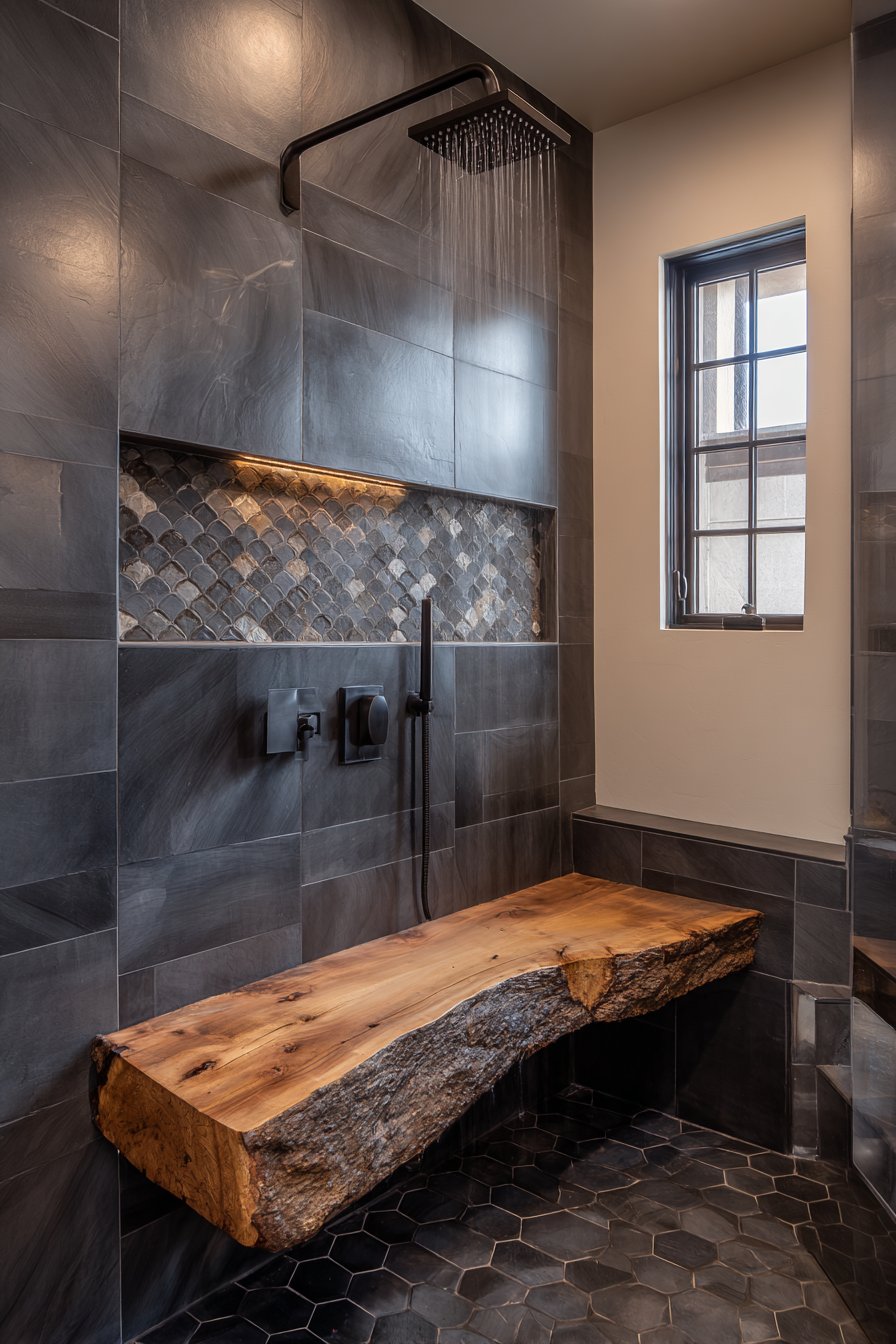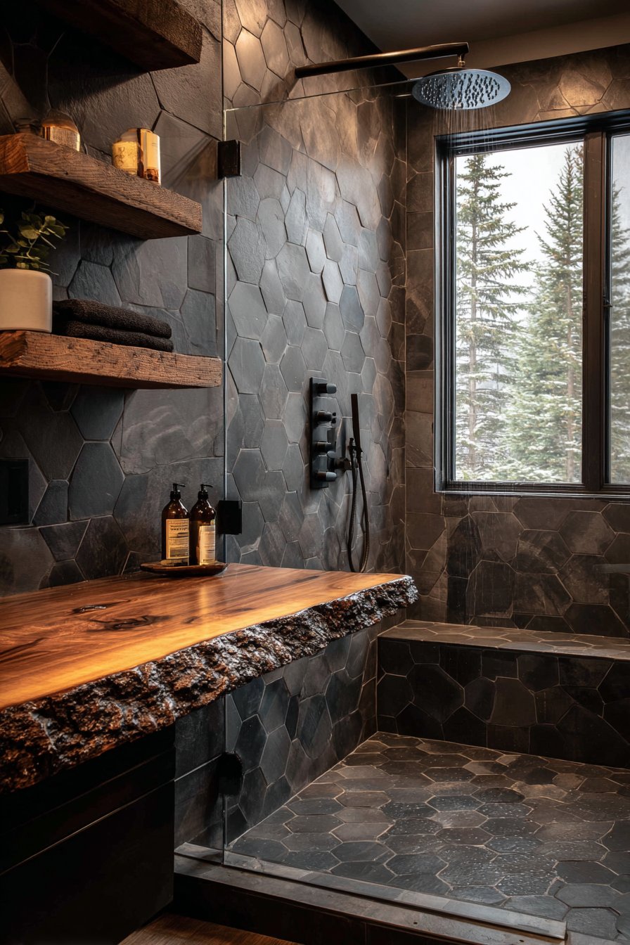 Matte black fixtures including a substantial rainfall showerhead complement the natural elements through their contemporary aesthetic and strong visual presence. The fixtures’ clean lines and modern finish prevent the space from feeling too rustic or dated, while their matte black color provides dramatic contrast against both the light stone tiles and the natural wood shelf. Hexagonal floor tiles in charcoal gray add another geometric element while their darker tone provides grounding weight that balances the lighter walls. The hexagon pattern introduces visual interest underfoot without competing with the walls’ focal points. A simple window frame allows soft natural light to enter, illuminating the shelf’s organic edges and the stone’s textural surface.