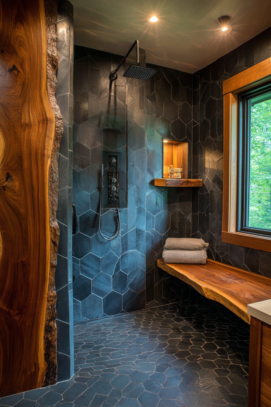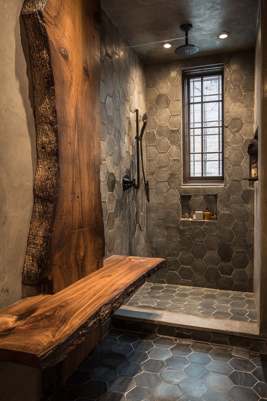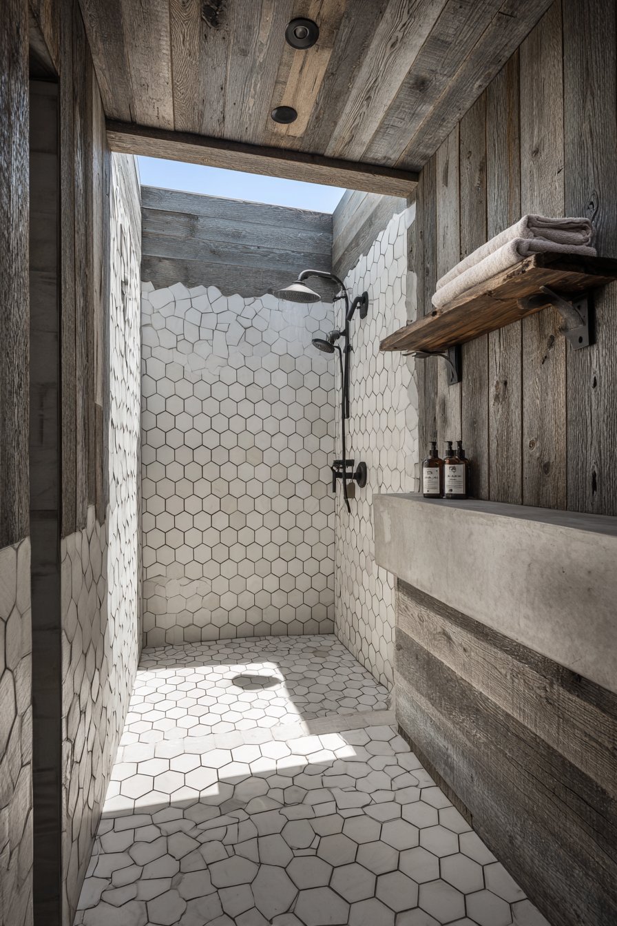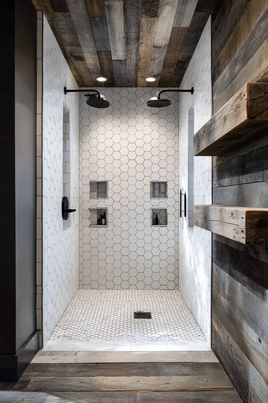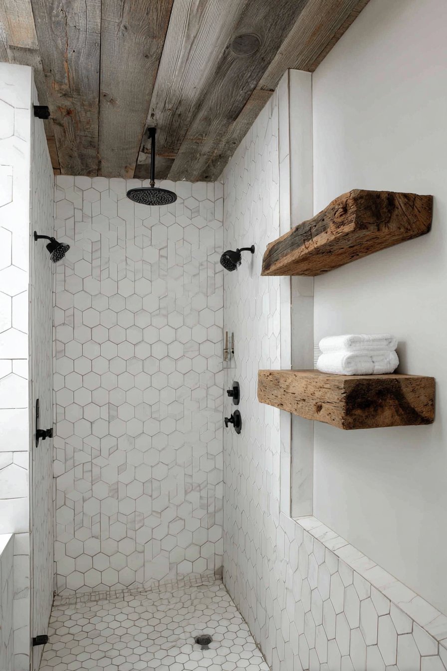 A rustic wood accent strip at approximately mid-height runs horizontally around the shower perimeter, creating visual movement and additional material interest while breaking the wall’s vertical expanse. This accent strip introduces another natural element that reinforces the ceiling’s rustic character while its horizontal orientation provides calm counterpoint to the hexagonal tile pattern. Matte black industrial-style shower fixtures provide contemporary contrast through their modern finish and minimalist design, their strong visual presence anchoring the design while preventing it from feeling too soft or traditional. Corner floating shelves constructed from thick reclaimed wood slabs provide practical storage while introducing another rustic element, their substantial thickness and visible saw marks celebrating honest craftsmanship.