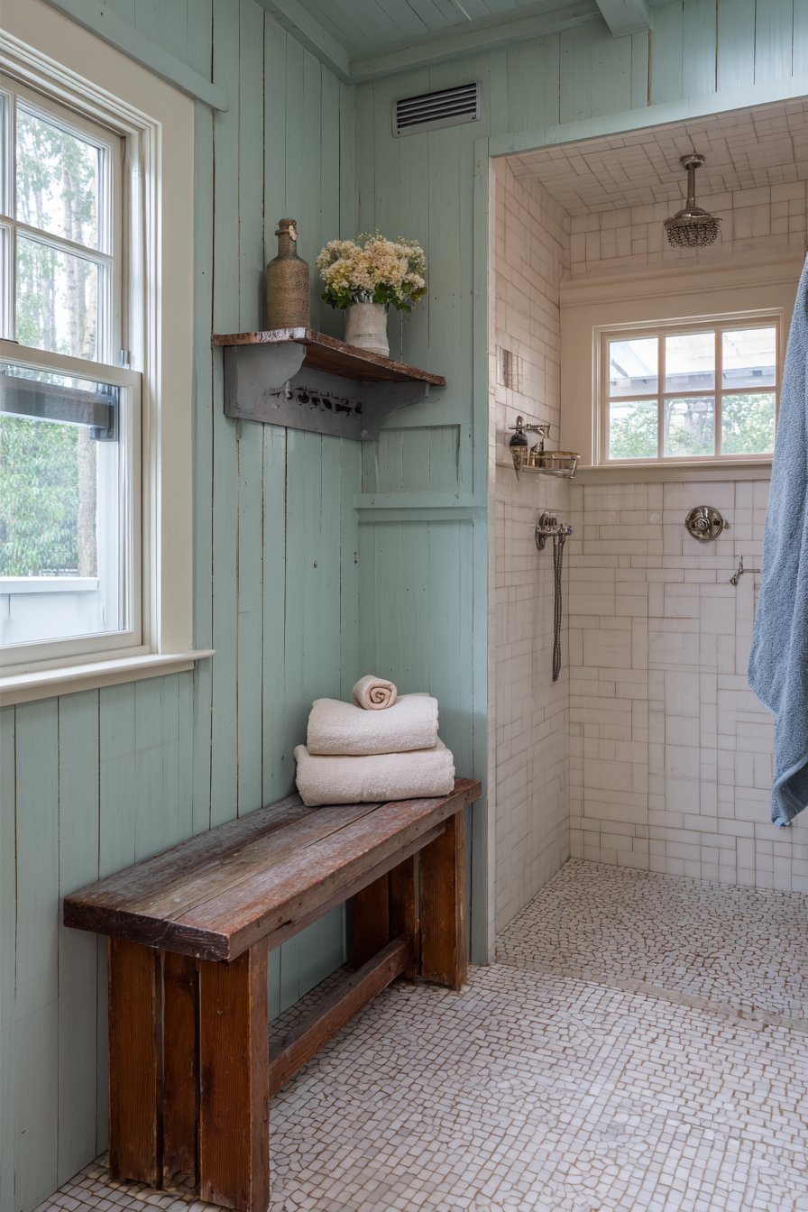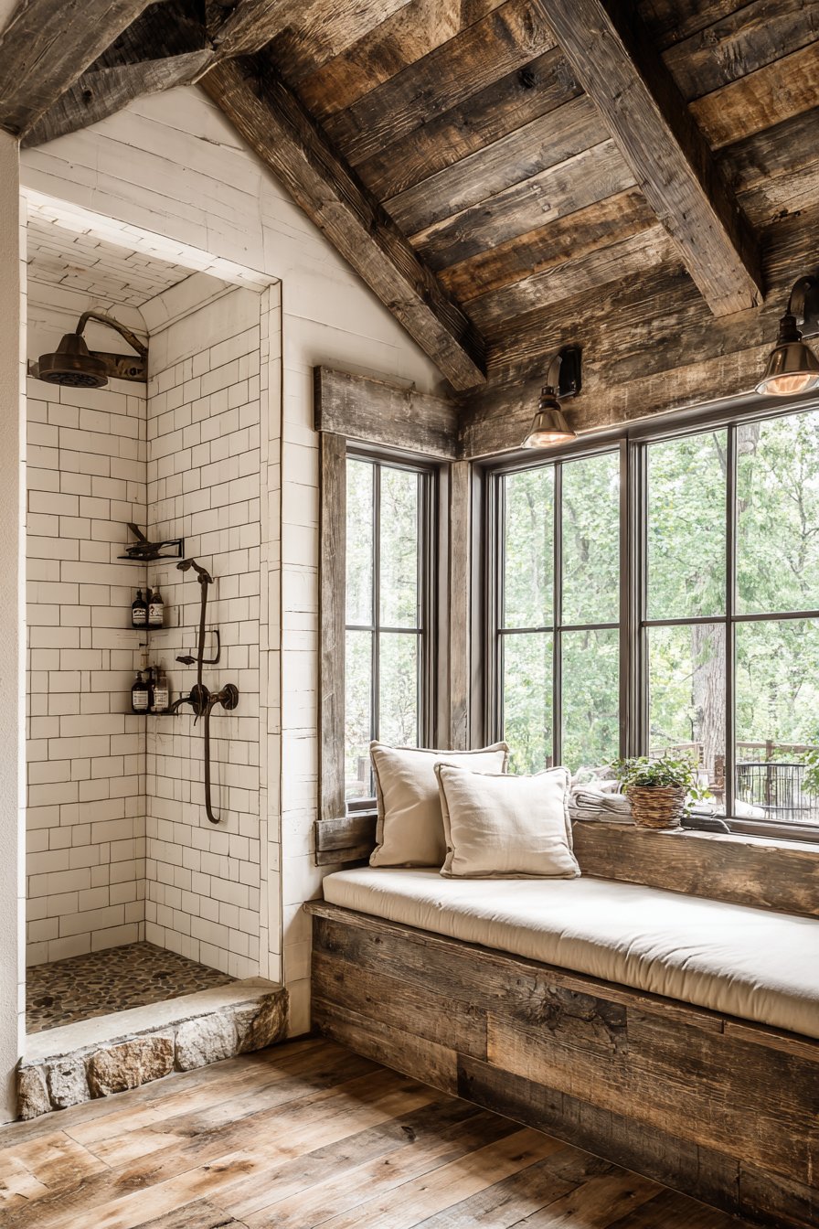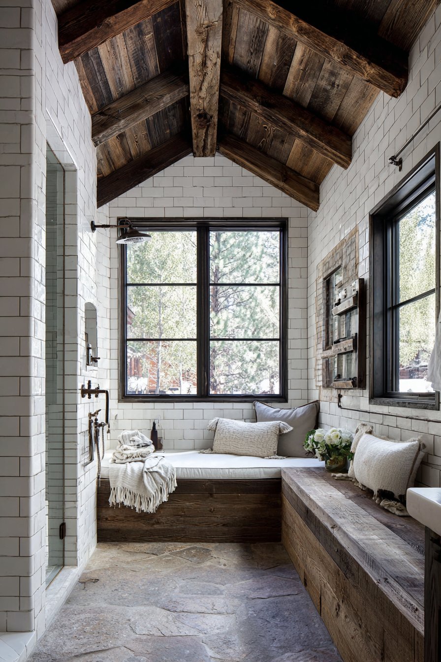 Bronze shower fixtures including a vintage-style handheld unit on a sliding bar provide flexible functionality wrapped in period-appropriate design. The bronze finish’s warmth complements the dark ceiling beams while the sliding bar mechanism allows users of different heights to position the handheld shower at optimal levels. A built-in window seat with comfortable cushion provides a dedicated changing and toweling area within the shower room itself, transforming the space from simple shower to full bathing chamber. Multiple windows create a bright, airy atmosphere that prevents the vaulted space from feeling cavernous, while their placement provides cross-ventilation essential for moisture management in this larger shower room.