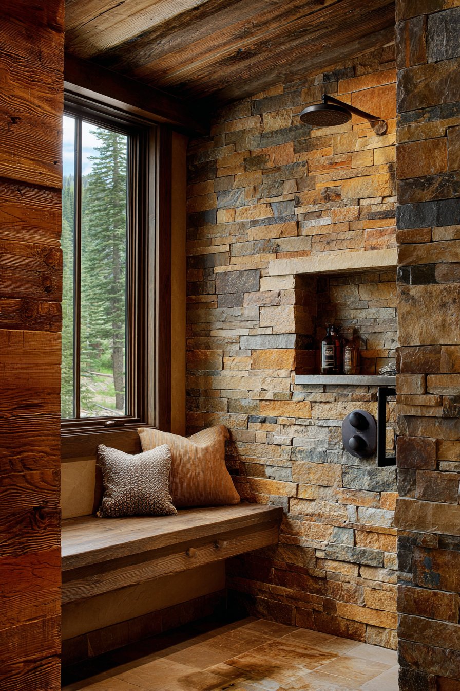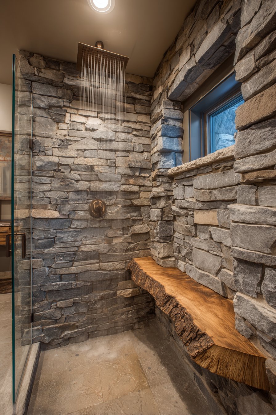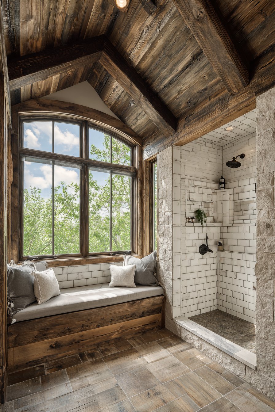 Key design considerations include: ensuring structural framing can support the vaulted ceiling’s weight and span requirements, treating all wooden ceiling elements with appropriate moisture-resistant finishes suitable for the humid environment despite the ceiling’s height above water sources, installing adequate ventilation capable of managing moisture in the larger cubic footage this design creates, selecting cushion fabrics and fillings specifically rated for wet environments to prevent mold growth on the window seat, and positioning windows to provide natural light and ventilation while maintaining privacy from outside views. The stone wainscoting should receive proper waterproofing membrane installation behind it to protect lower walls from direct water exposure. This rustic shower idea demonstrates how architectural ambition and generous proportions can create truly memorable bathing experiences.