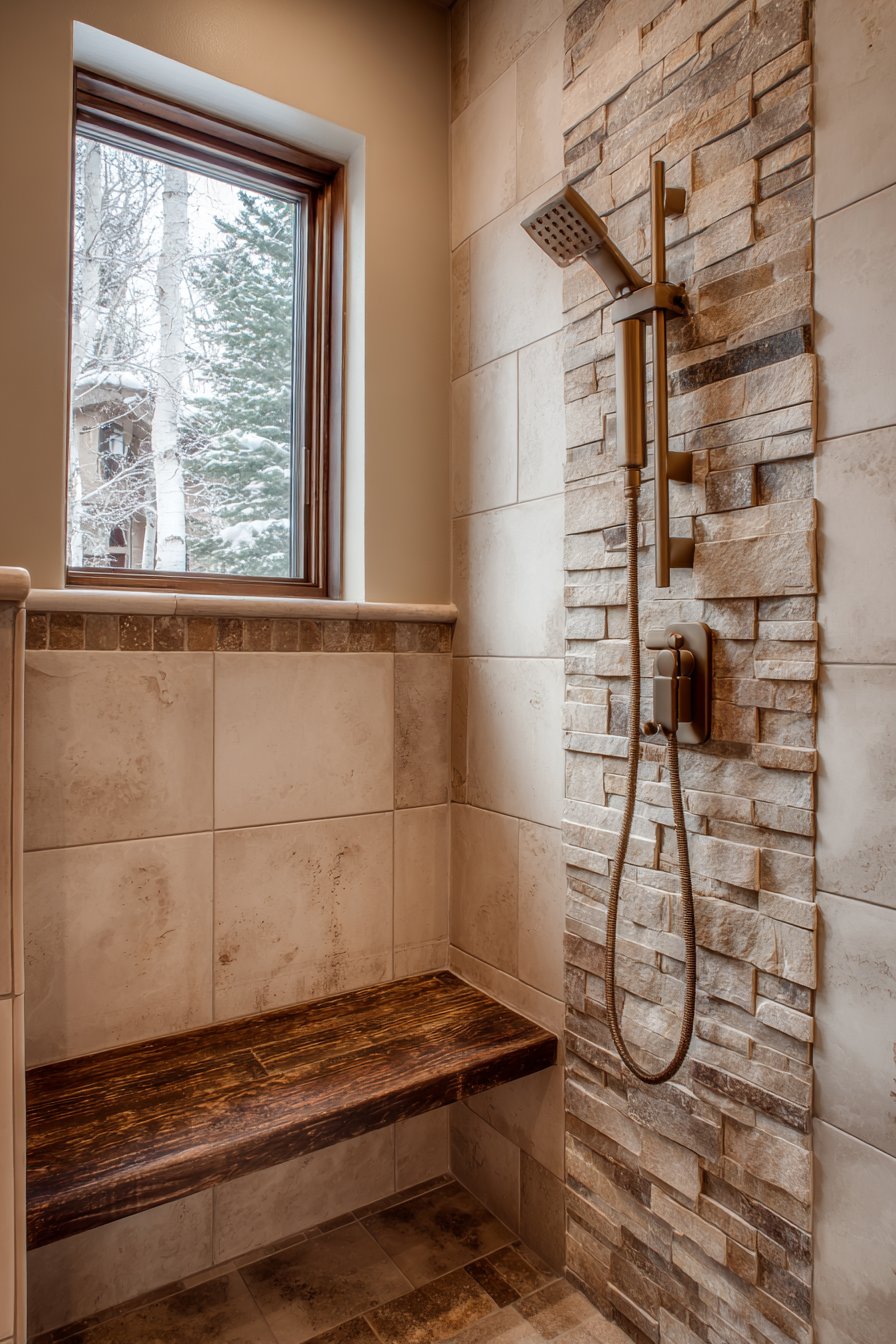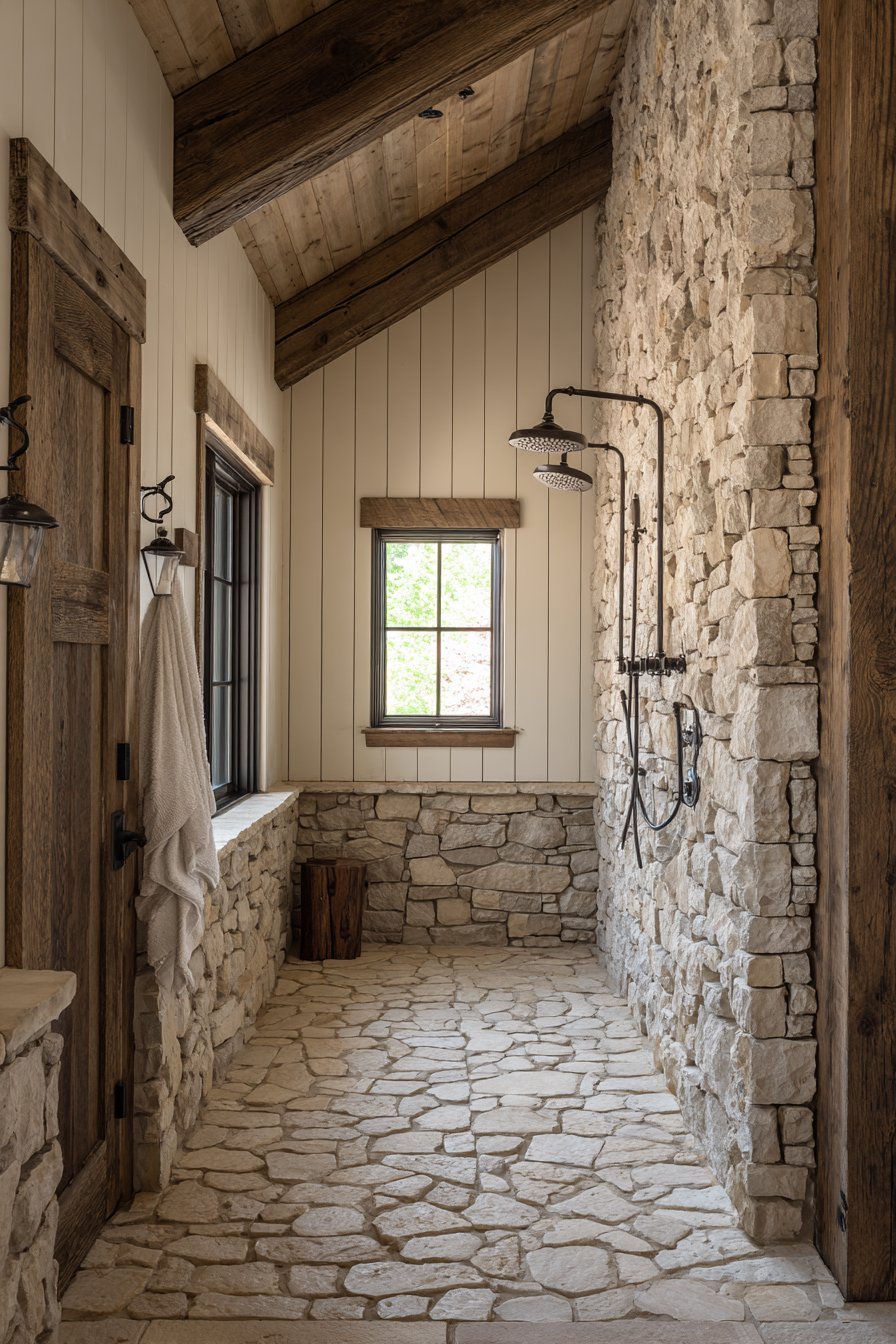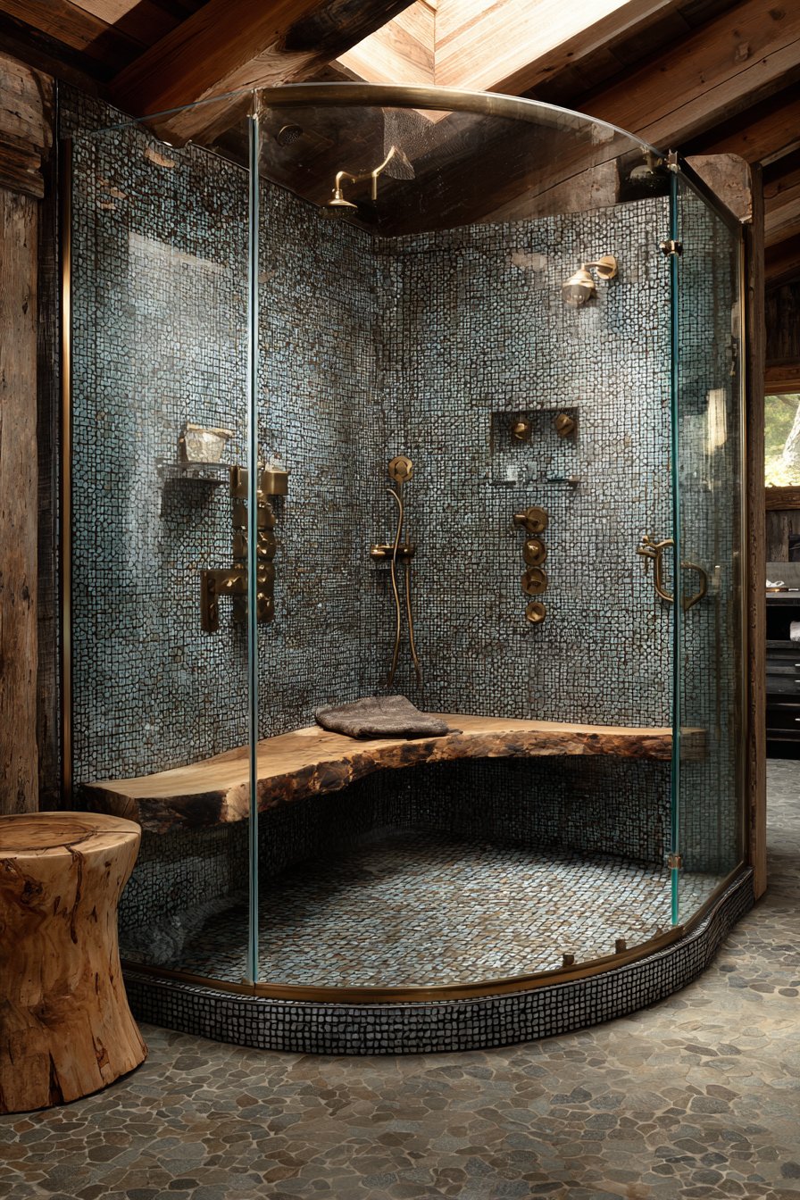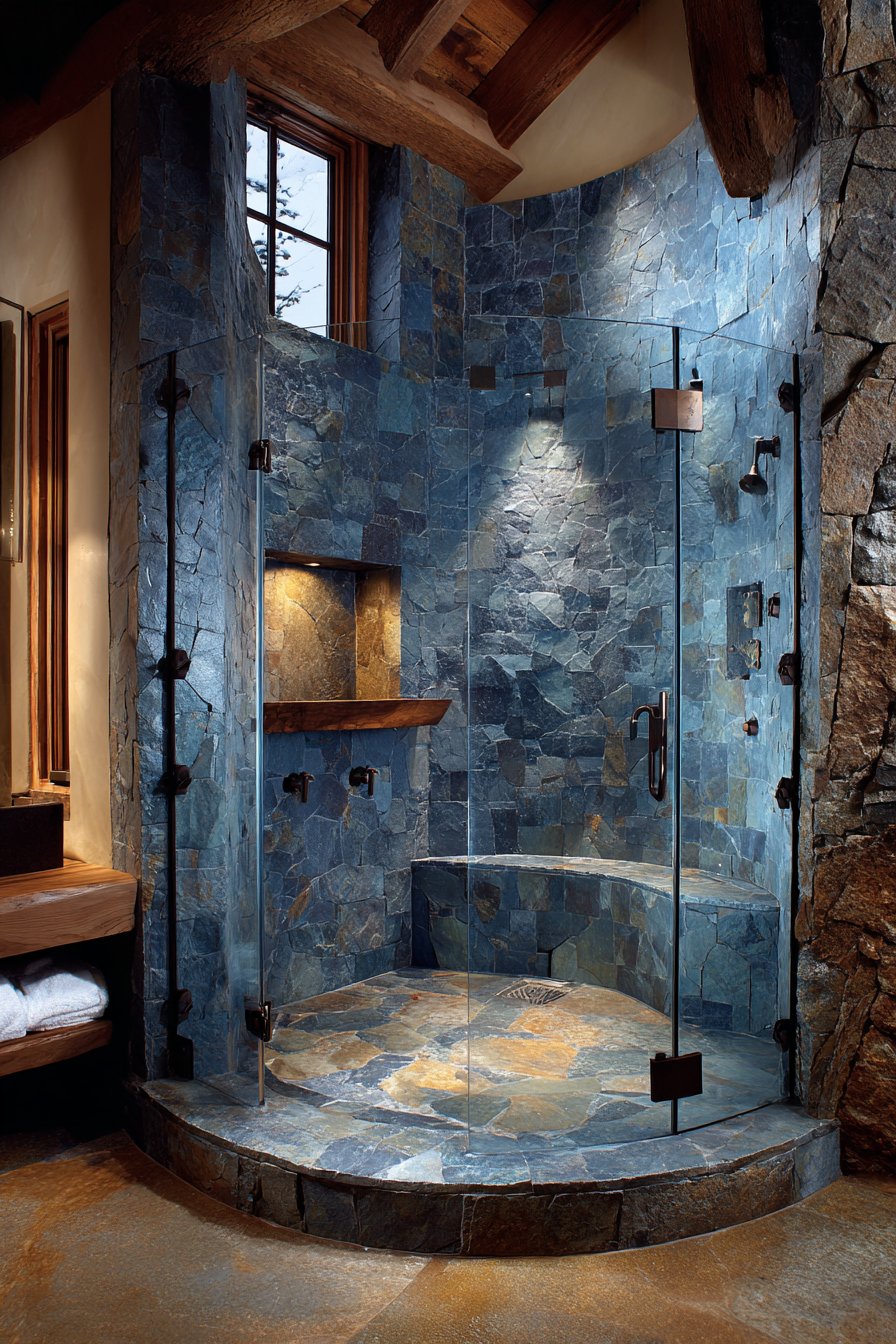 Key design considerations include: ensuring structural framing can support the vaulted ceiling’s weight and span requirements, treating all wooden ceiling elements with appropriate moisture-resistant finishes suitable for the humid environment despite the ceiling’s height above water sources, installing adequate ventilation capable of managing moisture in the larger cubic footage this design creates, selecting cushion fabrics and fillings specifically rated for wet environments to prevent mold growth on the window seat, and positioning windows to provide natural light and ventilation while maintaining privacy from outside views. The stone wainscoting should receive proper waterproofing membrane installation behind it to protect lower walls from direct water exposure. This rustic shower idea demonstrates how architectural ambition and generous proportions can create truly memorable bathing experiences.