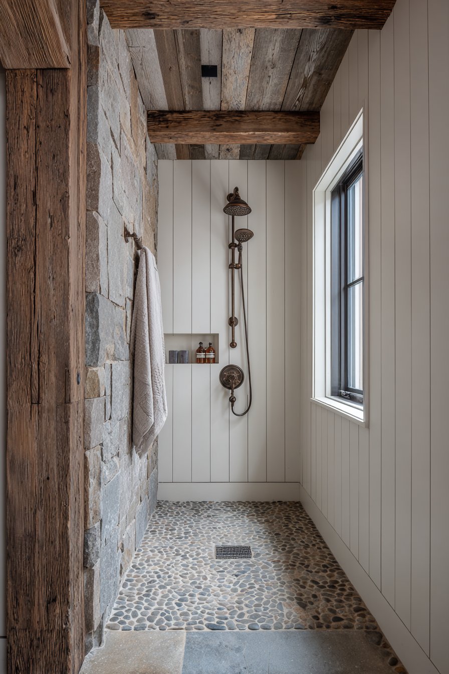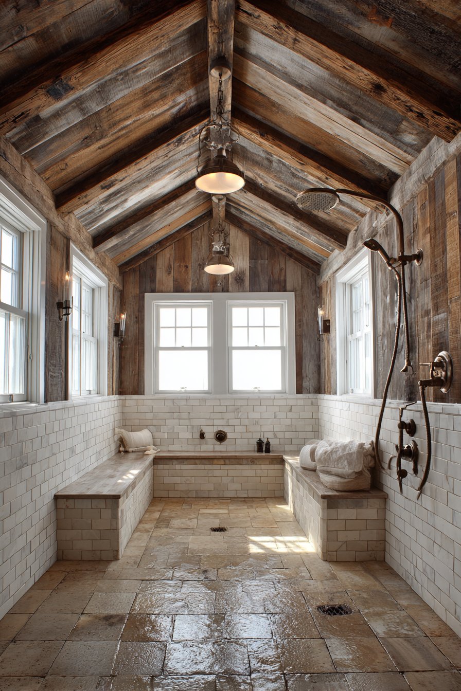 Architectural volume transforms this shower into a room-within-a-room experience, demonstrating how rustic shower ideas can embrace verticality and spatial drama. The vaulted ceiling features exposed dark wood beams contrasting beautifully with white-painted tongue-and-groove boards between them, creating a classic architectural treatment that draws the eye upward and emphasizes the shower’s generous height. The dark beams provide structural visual weight while the white boards between them reflect light and prevent the ceiling from feeling heavy or oppressive. Walls combine classic white subway tile installation with natural stone wainscoting extending approximately three feet high, creating a thoughtful material transition that manages both aesthetics and practicality.