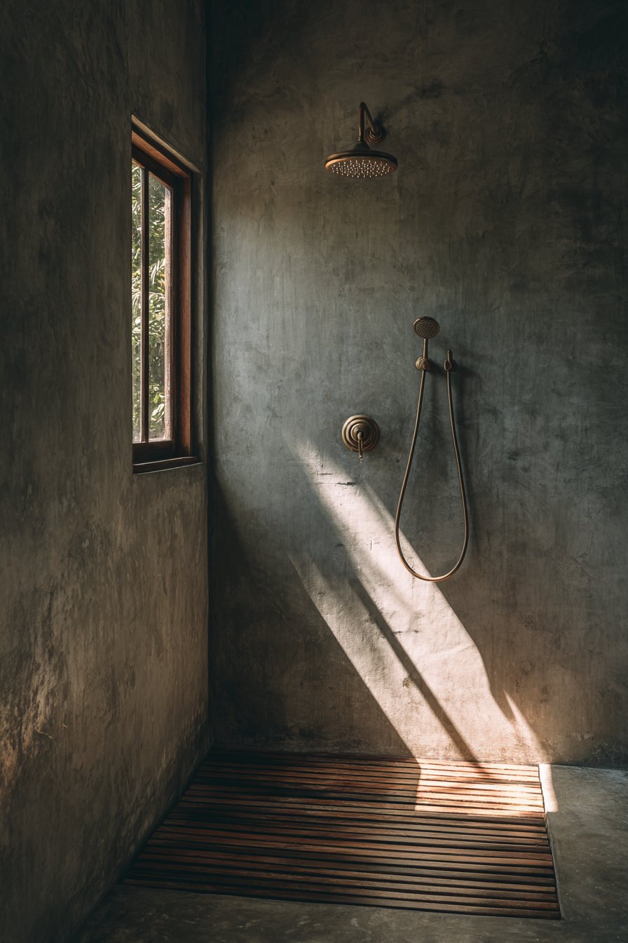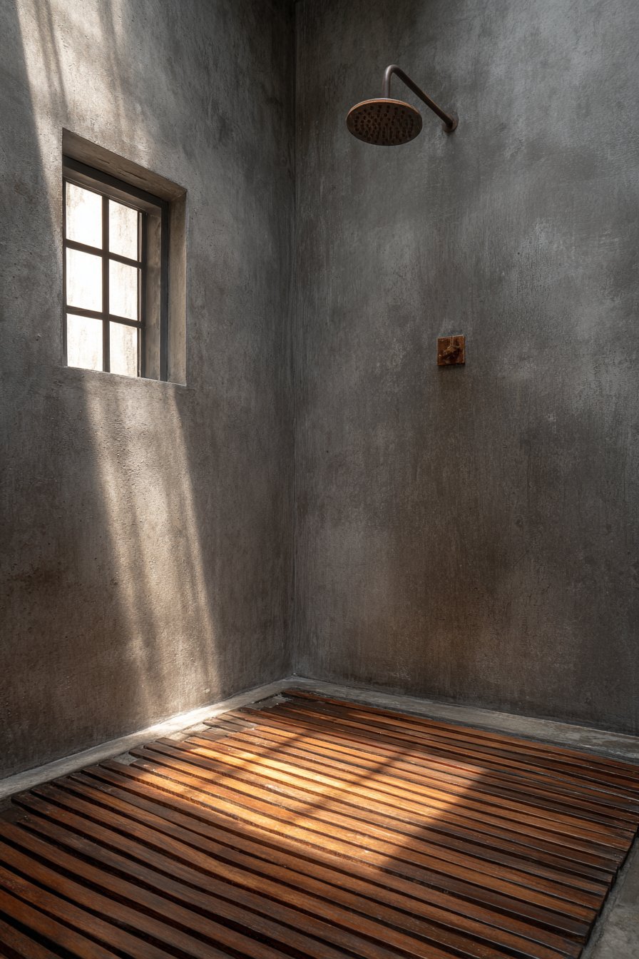 Teak wood floor grating over a concrete shower pan introduces natural warmth underfoot while serving the practical purpose of elevating users above pooling water and providing excellent drainage. The teak’s rich golden-brown tone creates striking contrast against the gray concrete, while the slatted construction allows water to drain freely while providing comfortable footing. The teak’s natural oil content makes it ideal for wet environments, though regular oiling maintains its rich color and prevents the silvery gray patina that develops on untreated teak exposed to water. A single small window with minimalist steel frame provides light and ventilation without disrupting the space’s clean-lined aesthetic.