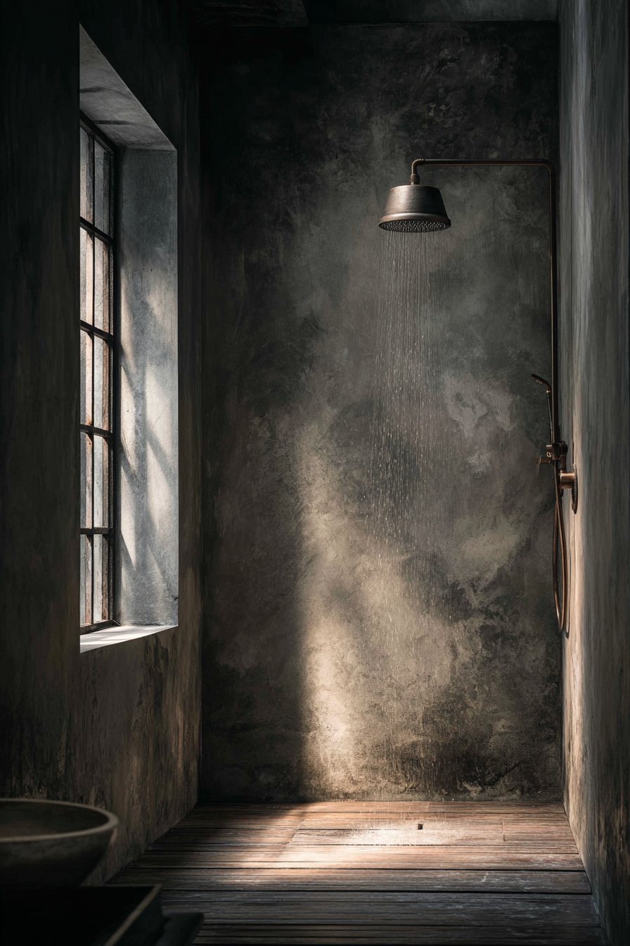 Minimalist sensibilities meet rustic materials in this pared-down rustic shower idea featuring smooth concrete walls showing subtle trowel marks and natural texture variation. The concrete’s natural gray displays the honest character of a poured material, with slight color shifts and surface imperfections that add character without feeling unfinished or rough. The walls’ smooth finish provides textural contrast to other elements while their monolithic appearance creates a calm, meditative backdrop. A simple bronze rainfall showerhead mounts directly to the wall, its warm metallic finish and traditional form providing the only decorative element needed against the concrete’s minimalist canvas.