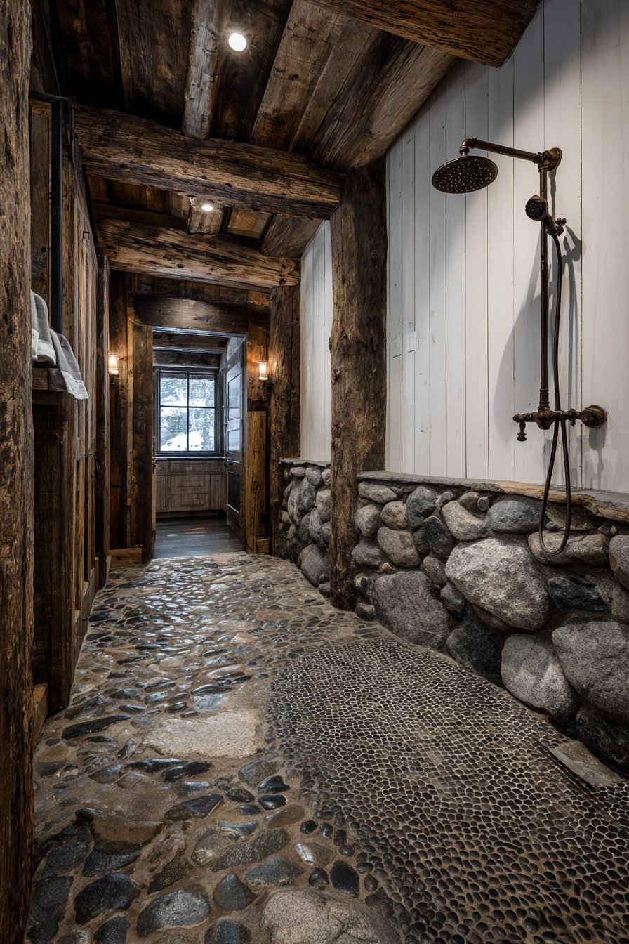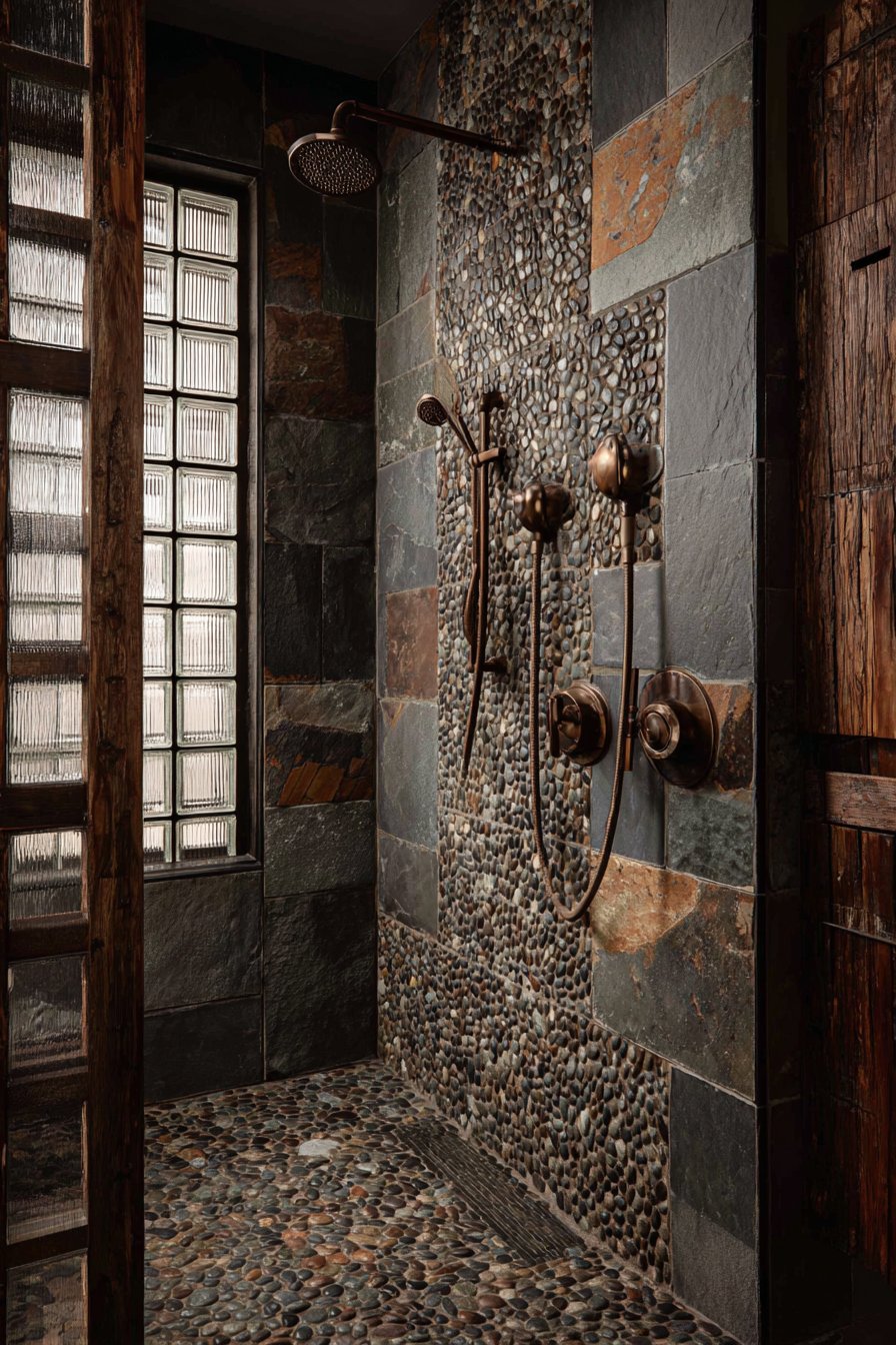 Interior design photography with balanced exposure highlights the tactile quality of the pebble mosaic and the authentic materials throughout. The camera captures how light plays across the pebbles’ rounded surfaces, creating highlights and shadows that emphasize their three-dimensional character, while the slate’s cleft surface provides textural backdrop that enhances rather than competes with the pebble wall.