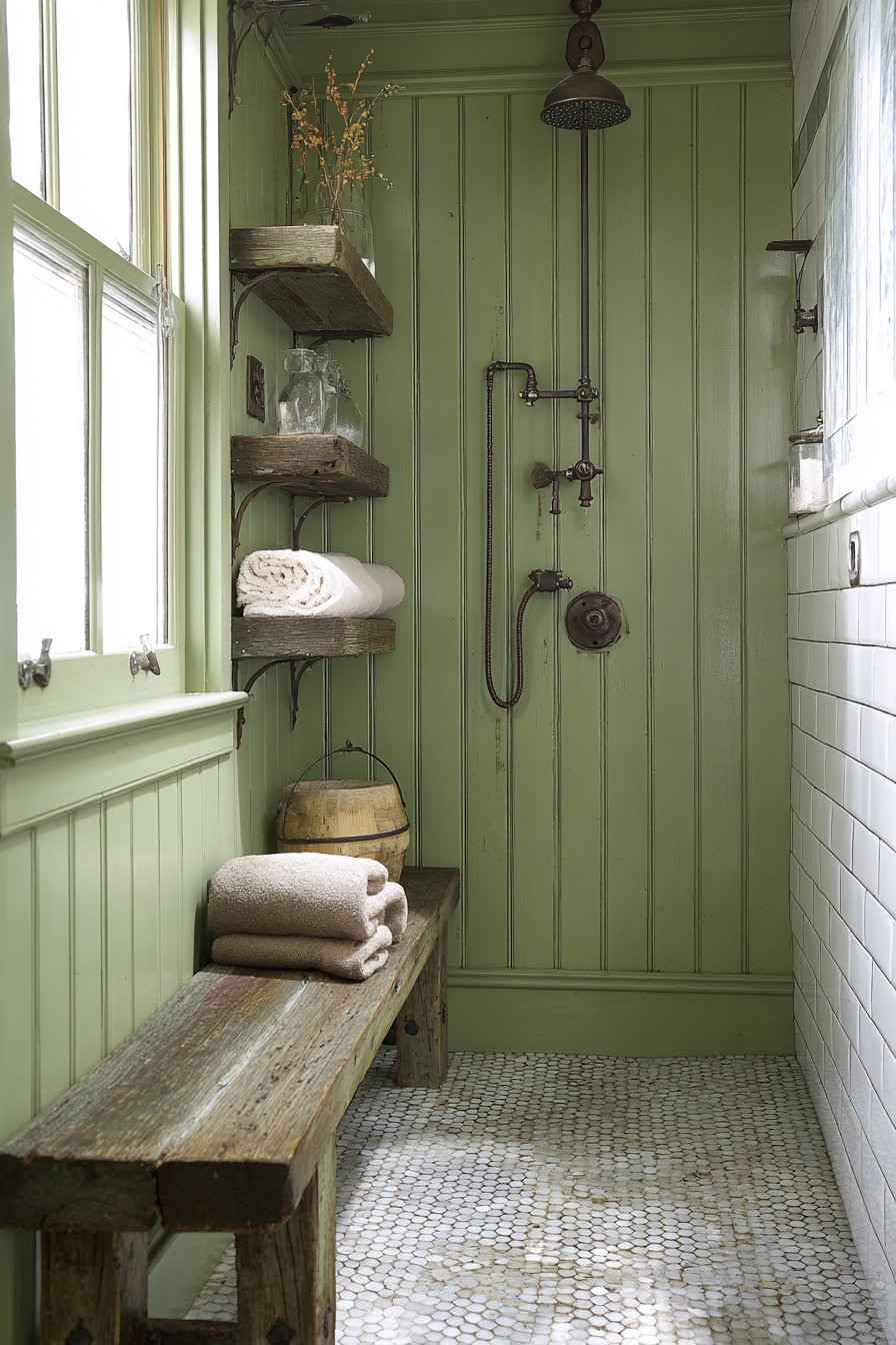Fresh country charm characterizes this rustic shower idea featuring painted beadboard walls in soft sage green that create a cottage-like atmosphere while serving practical moisture-resistant purposes. The beadboard, properly sealed for moisture resistance, displays subtle vertical texture that adds visual interest without overwhelming the space. The soft sage green provides calming color while the paint finish offers excellent moisture resistance superior to natural wood in wet environments. White subway tile installation from floor to wainscot height provides practical water protection in the highest-exposure areas while its classic pattern and pristine color create clean contrast with the painted beadboard above.