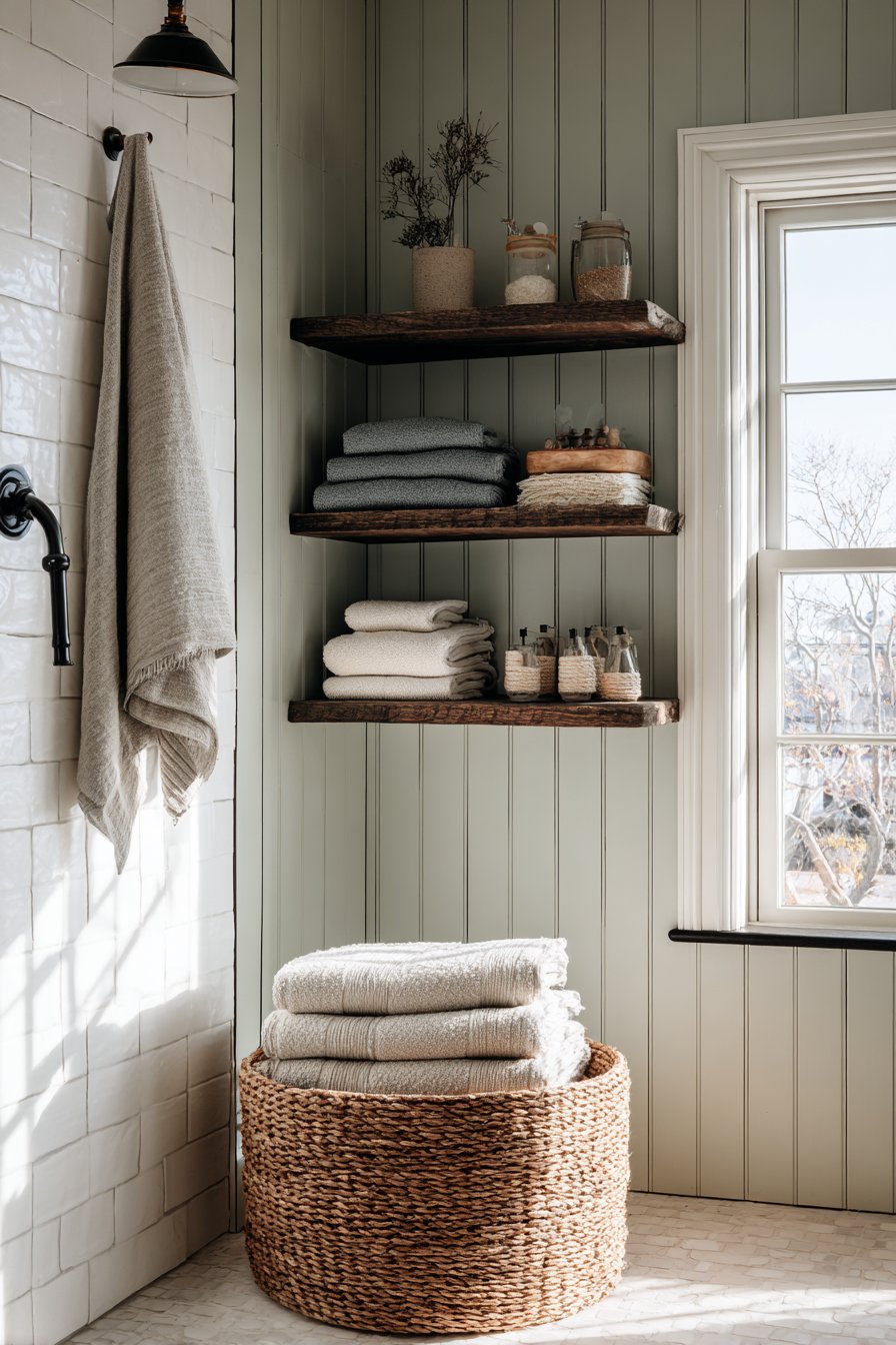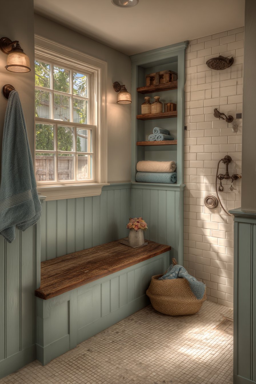 Vintage-reproduction bronze fixtures including deliberately exposed shower plumbing celebrate honest functionality while adding industrial-rustic character. The exposed pipes become intentional design elements rather than unsightly necessities, their bronze finish aging gracefully over time. Open wood shelving painted to match the beadboard provides practical storage for rolled towels and rustic accessories while maintaining color harmony. The shelves’ open construction prevents moisture accumulation while their simple bracket design reinforces the farmhouse aesthetic. Natural window light creates an inviting atmosphere, the soft illumination highlighting the painted wood’s subtle texture while keeping the space feeling fresh and bright rather than dark or heavy.