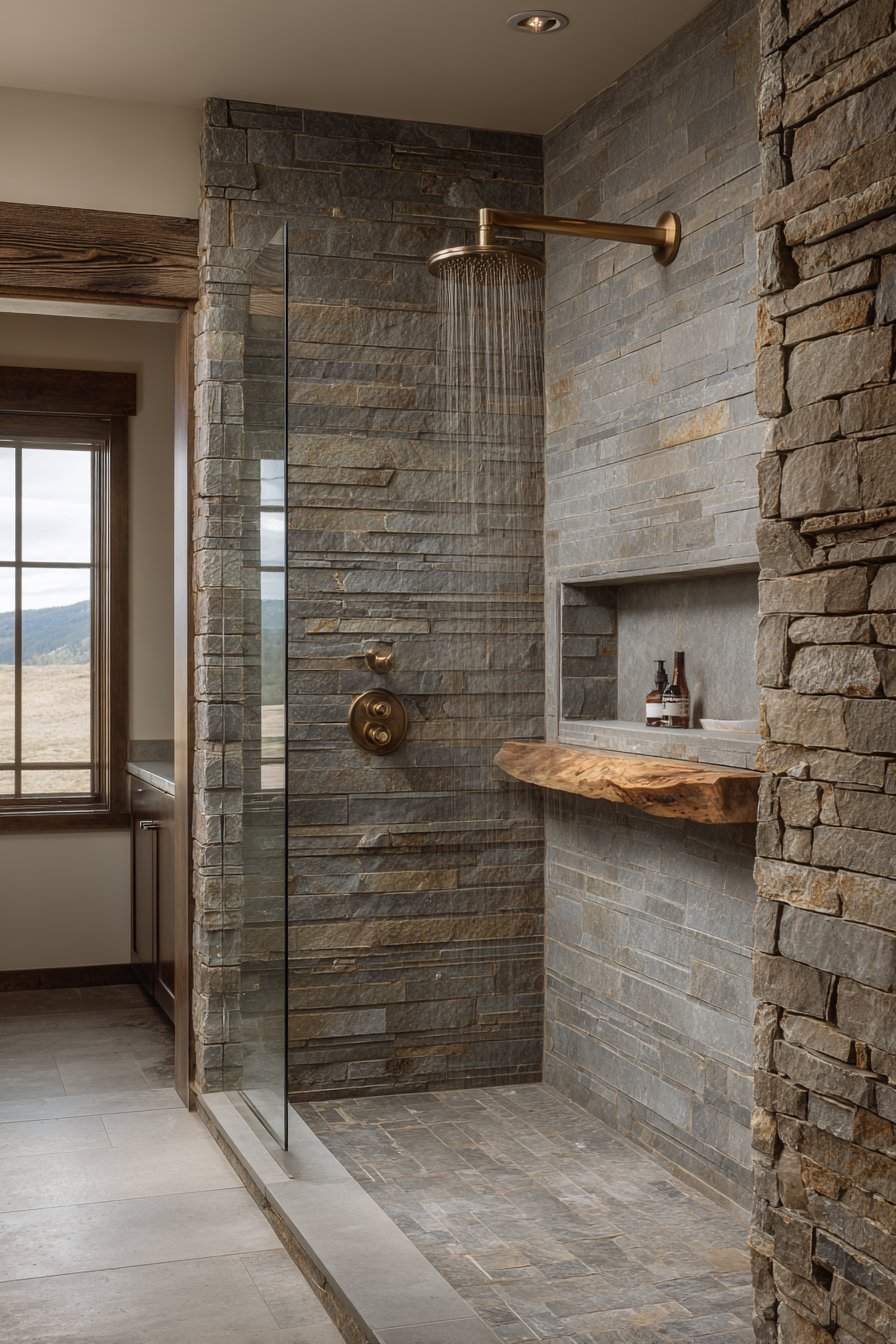 Brushed bronze rainfall showerhead and coordinating fixtures add warmth through their metallic finish while their contemporary styling prevents the space from feeling overly rustic or historical. The brushed finish provides subtle texture that complements the stone’s natural surface while requiring less maintenance than polished finishes that show water spots prominently. A natural wood corner shelf with live edge detail provides organic accent and practical storage, its curved natural edge celebrating the tree’s original form rather than forcing geometric conformity. Recessed lighting combined with natural window light works together to highlight the stone texture variations, the directional recessed lights creating dramatic shadows across the ledger panels’ dimensional surface while window light provides overall illumination.