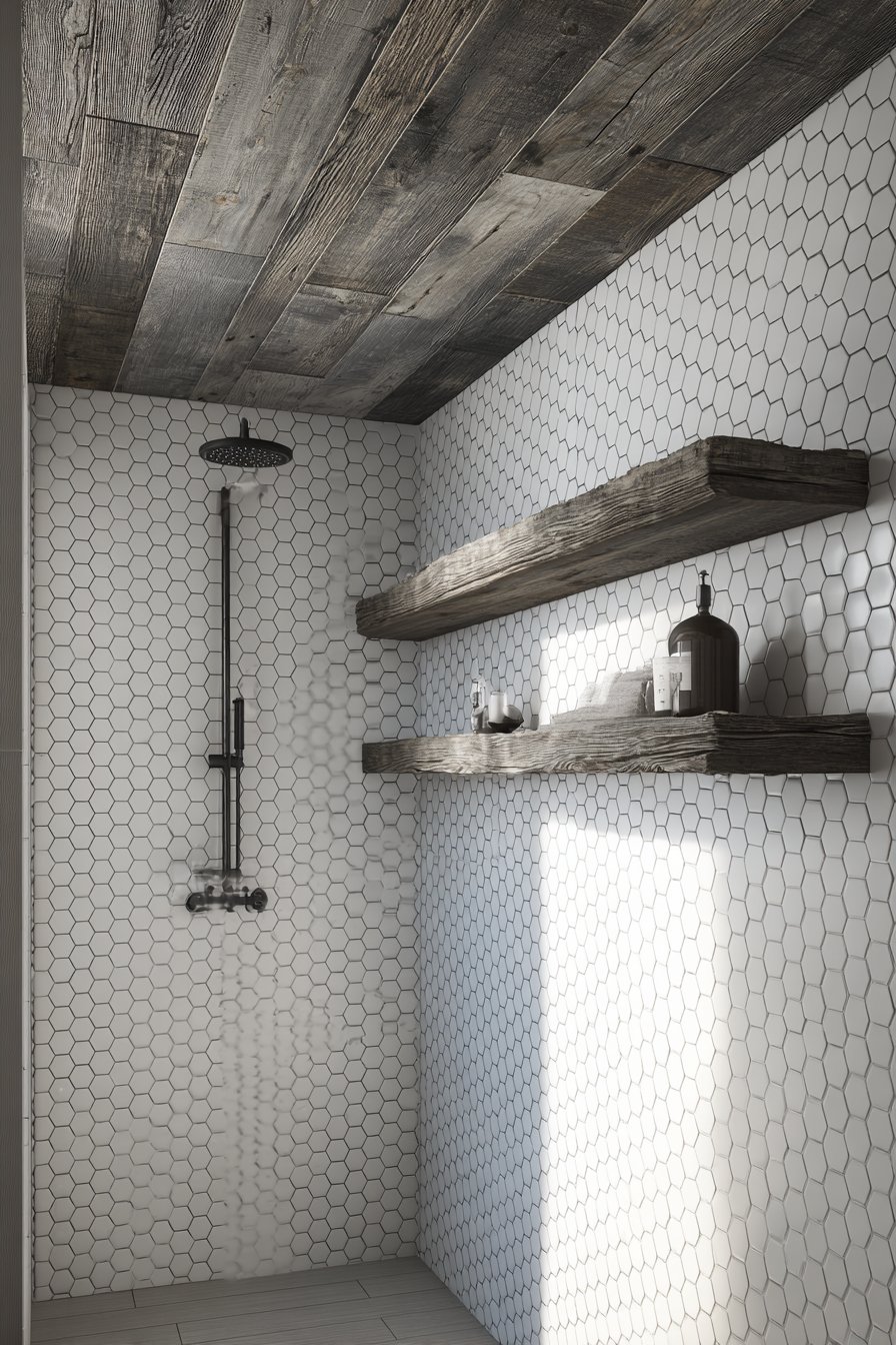 Unexpected overhead drama transforms this rustic shower idea through a ceiling covered in narrow wood planks finished in weathered gray that draws the eye upward and creates architectural interest often overlooked in shower design. The weathered gray finish displays natural color variation and subtle grain patterns that feel authentically aged rather than artificially distressed, while the narrow plank width creates rhythm that adds visual interest without overwhelming the space. This ceiling treatment transforms the overhead plane from an afterthought into a distinctive design feature. White hexagonal tiles on the walls provide geometric contrast to the ceiling’s linear pattern while maintaining bright, clean surfaces that keep the space feeling fresh rather than cave-like despite the wooden ceiling.
