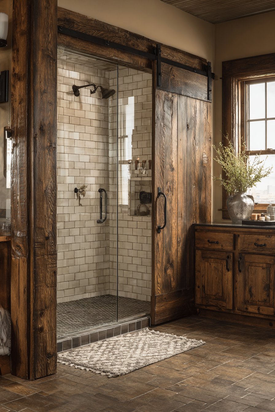 This approach offers particular advantages for homeowners seeking rustic character without committing to extensive natural stone or wood installations throughout the shower. The barn door creates immediate impact while the simpler tile treatment keeps costs manageable and maintenance straightforward.