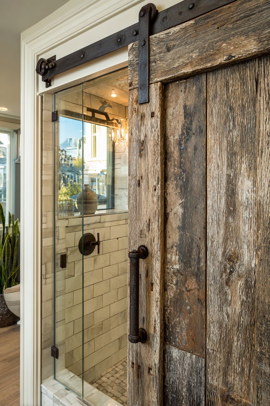 The design successfully balances rustic elements with practical functionality. The dark grout lines between subway tiles provide definition and prevent the wall treatment from appearing too plain or clinical, while also hiding the inevitable mineral deposits that accumulate in shower environments. Oil-rubbed bronze fixtures complement the door’s black hardware, creating a cohesive metal palette throughout the space. Natural light entering from a nearby window illuminates both the weathered wood door and the pristine tile interior, creating interesting plays of light and shadow while ensuring the space feels bright rather than cave-like despite the substantial wooden door.