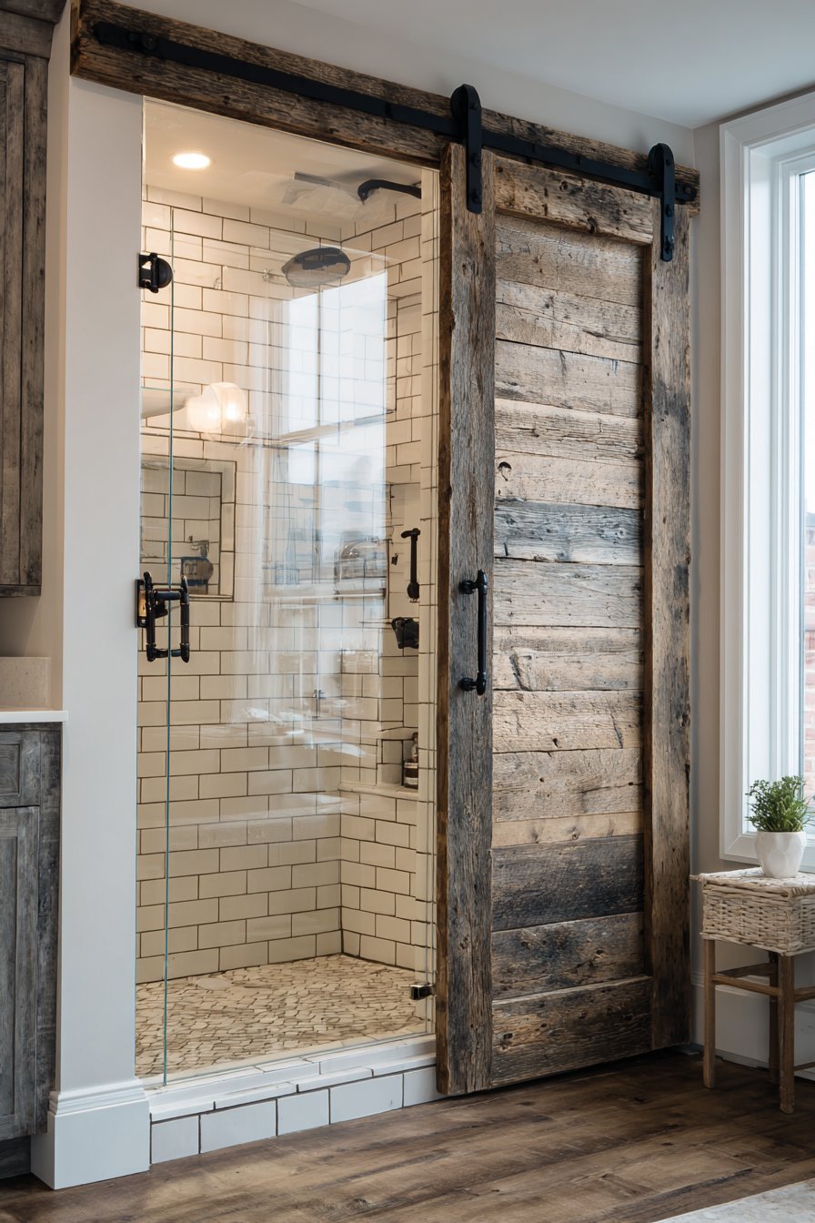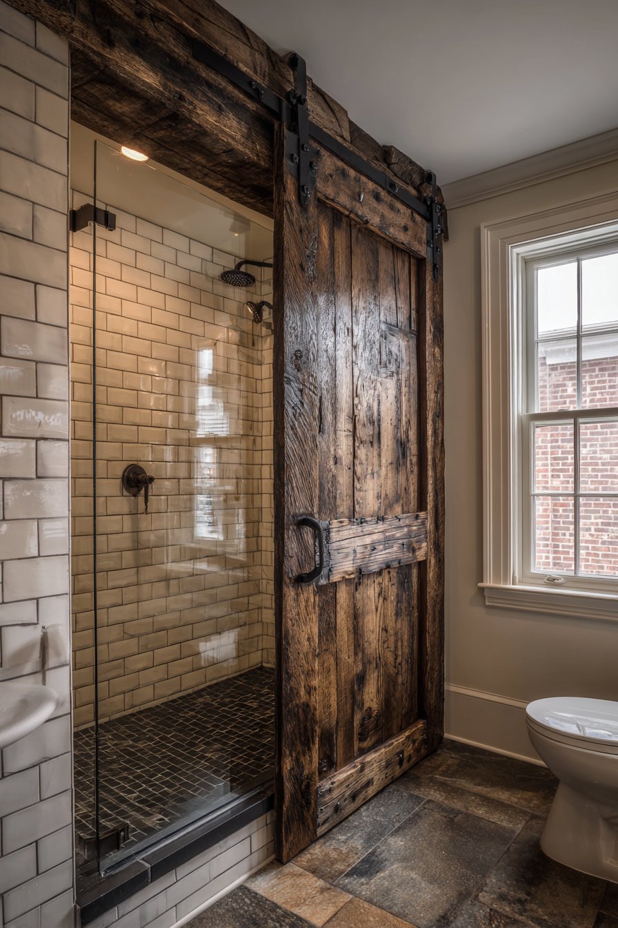 This creative rustic shower idea reimagines the standard shower enclosure with a barn-style sliding door that immediately captures attention and establishes the space’s character. The door, constructed from weathered wood planks displaying authentic wear patterns and varied gray tones, features substantial black iron hardware and a clear glass panel insert that maintains visibility while the wood creates privacy and visual interest. This unexpected element transforms what might otherwise be a standard shower into a distinctive design statement. The interior space takes a more restrained approach with cream subway tiles installed in traditional brick pattern, their clean lines and simple geometry providing calm contrast to the door’s rustic texture.