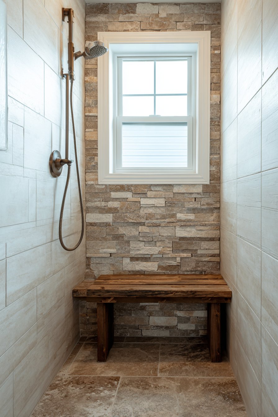 Important implementation considerations include: selecting stone pieces with relatively consistent thickness to ensure proper installation in the compact space where protruding stones could create collision hazards, ensuring proper waterproofing behind all stone installation despite the small scale, treating the reclaimed wood bench top with marine-grade sealer suitable for constant moisture exposure and regular reapplication, positioning the shower valve and handheld bar to ensure adequate elbow room despite the compact dimensions, and installing adequate ventilation even more critical in smaller spaces where moisture concentrates more quickly. The cream subway tile should use consistent grout width and color for professional appearance. This rustic shower idea proves that limited square footage needn’t limit character—strategic use of statement materials creates memorable spaces regardless of size.