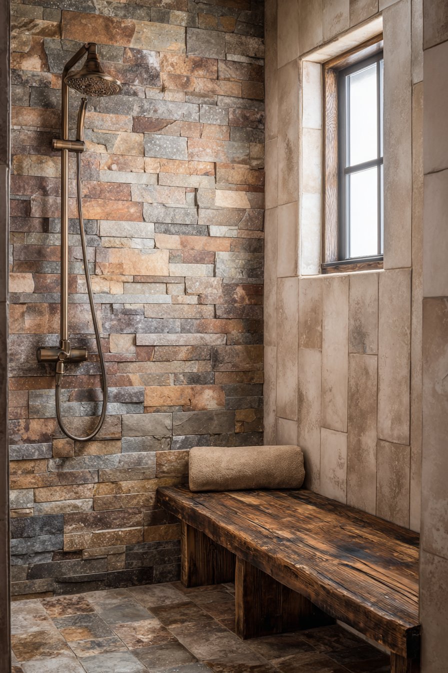Key design tips for achieving this look include: selecting stone pieces with complementary color tones to create cohesion rather than chaos, ensuring proper waterproofing behind all stone installations to prevent moisture damage, treating reclaimed wood with marine-grade sealants designed for high-moisture environments, choosing fixtures with finishes that naturally patina to avoid the “worn-out” look of artificially aged hardware, and incorporating adequate ventilation to prevent moisture buildup that could damage natural materials. This rustic shower idea represents the pinnacle of organic luxury, proving that natural materials can create sophisticated, spa-worthy spaces.