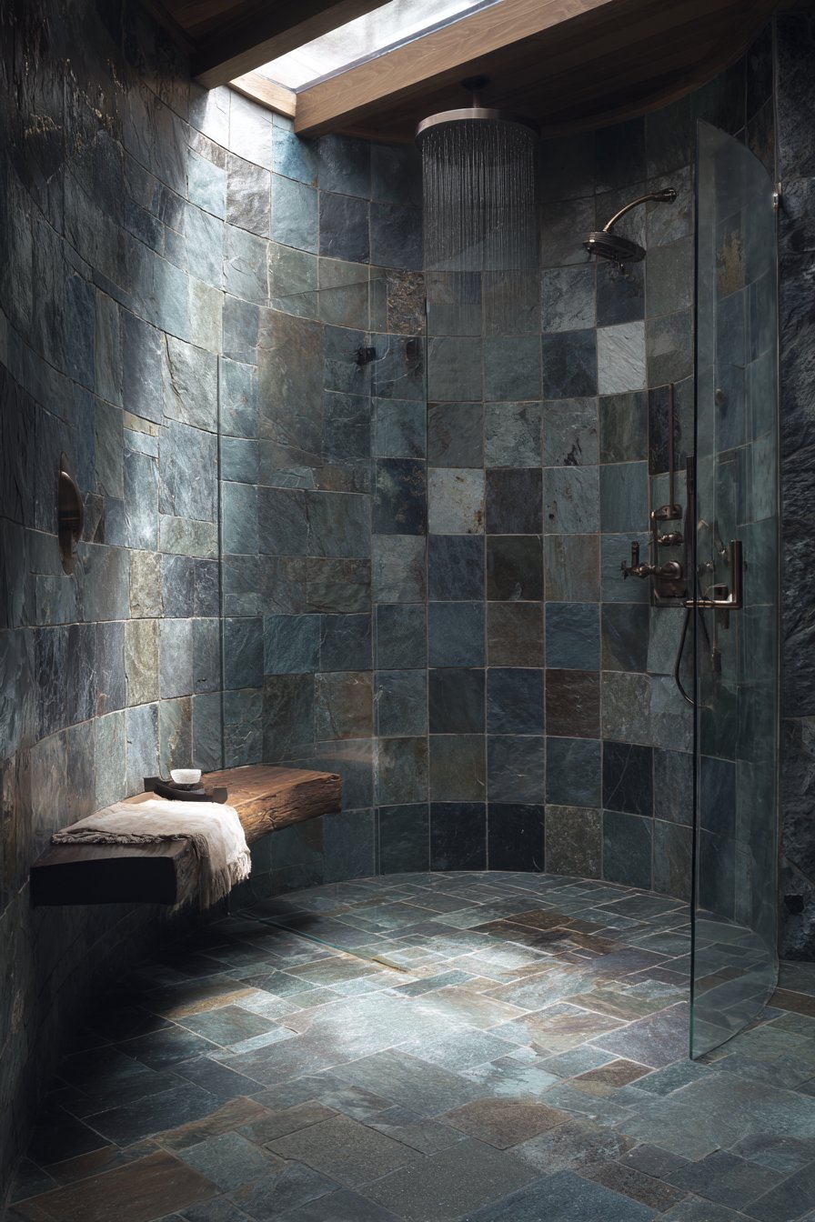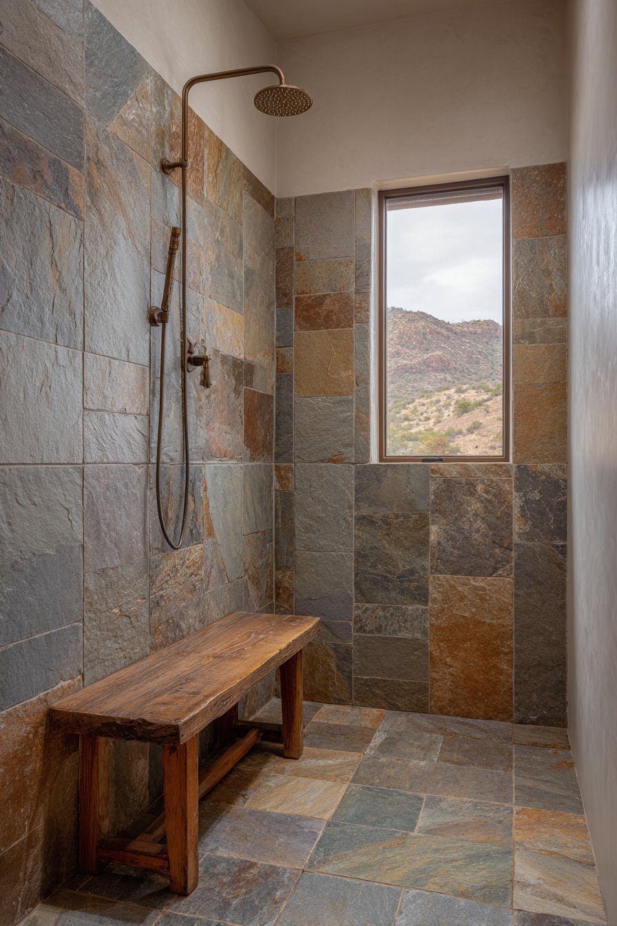 The industrial-style copper piping leading to an exposed showerhead introduces an unexpected element that bridges rustic and industrial design aesthetics. The copper, displayed proudly rather than concealed behind walls, develops a living patina over time that shifts from bright metallic orange through bronze tones toward eventual verdigris, creating an ever-evolving sculptural element within the space. A floating reclaimed wood bench provides both functional seating and another textural layer, its weathered surface and visible grain patterns adding warmth to the cooler slate and stone palette. The bench’s floating installation creates visual lightness while making floor cleaning considerably easier.