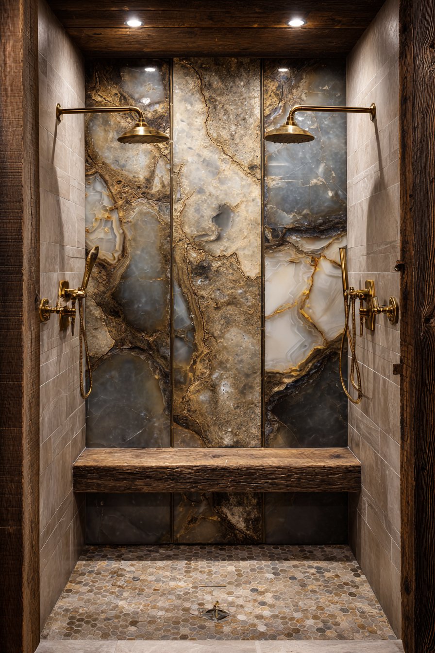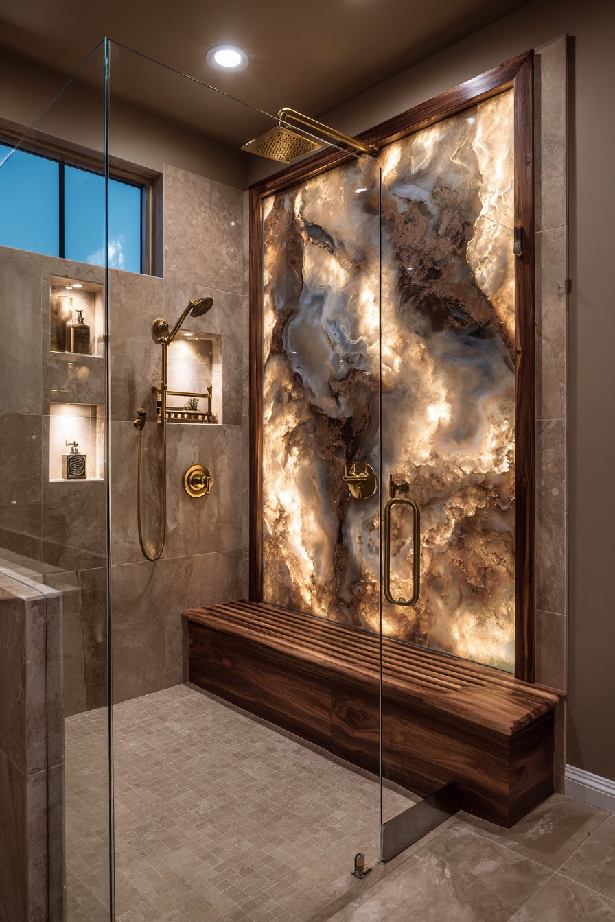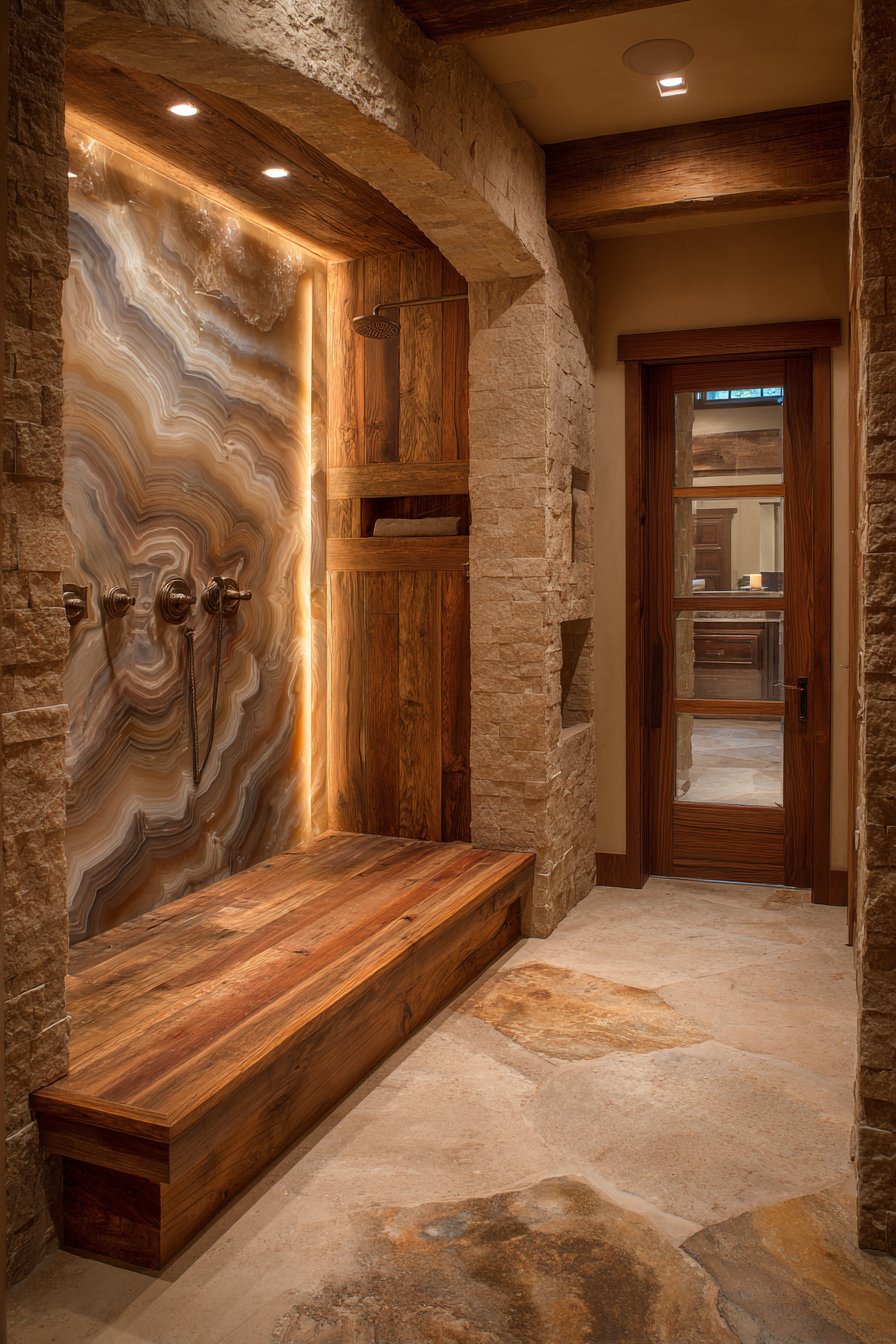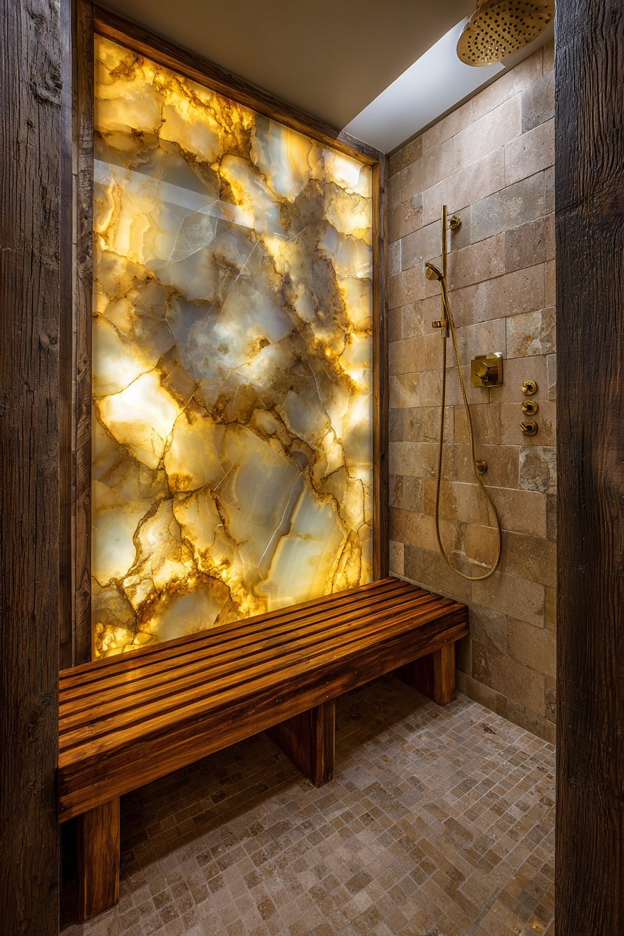 Dramatic lighting elevates this luxurious rustic shower idea featuring a book-matched onyx accent panel backlit to highlight the stone’s natural veining and translucent properties. The onyx, carefully selected and matched to create symmetrical patterns, displays warm amber and cream tones with distinctive veining that becomes luminous when backlit. This treatment transforms the stone from merely decorative to truly transcendent, creating a glowing focal point unlike anything standard tile installations can achieve. The onyx panel receives framing in rustic wood trim that grounds the luxury material with natural character while creating defined boundaries that emphasize the panel’s importance.