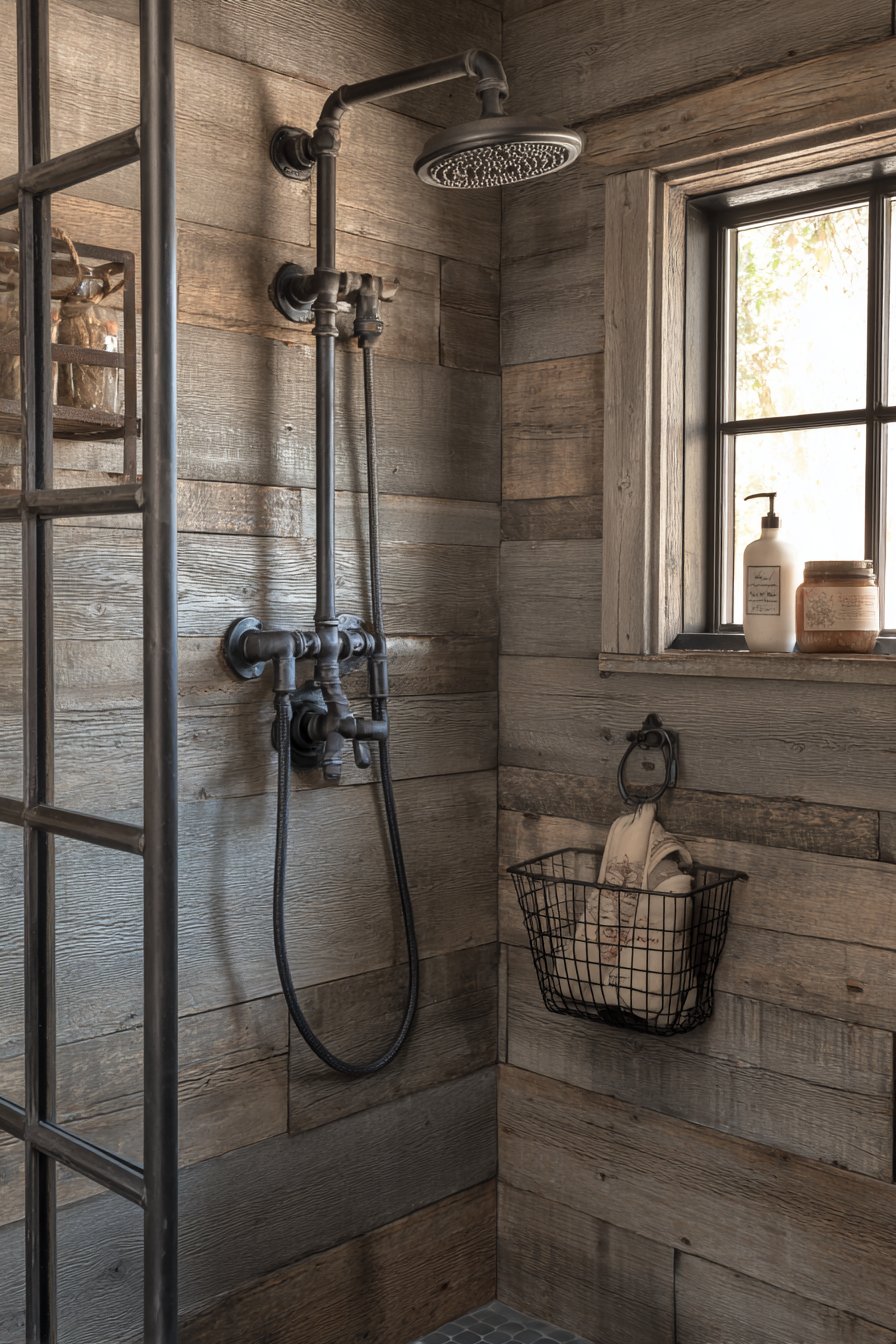 An exposed black iron pipe shower system with industrial valve handles and rainfall head celebrates utilitarian aesthetics while providing modern functionality behind its vintage appearance. The matte black iron creates powerful contrast against the varied wood tones, its strong visual presence anchoring the design while the deliberately visible plumbing celebrates honest functionality. A small window with black steel frame maintains consistency with the exposed pipe system while providing natural ventilation and light. A vintage-style wire basket mounted directly on the wood wall provides clever storage that reinforces the industrial aesthetic while solving the practical challenge of shower accessory organization.