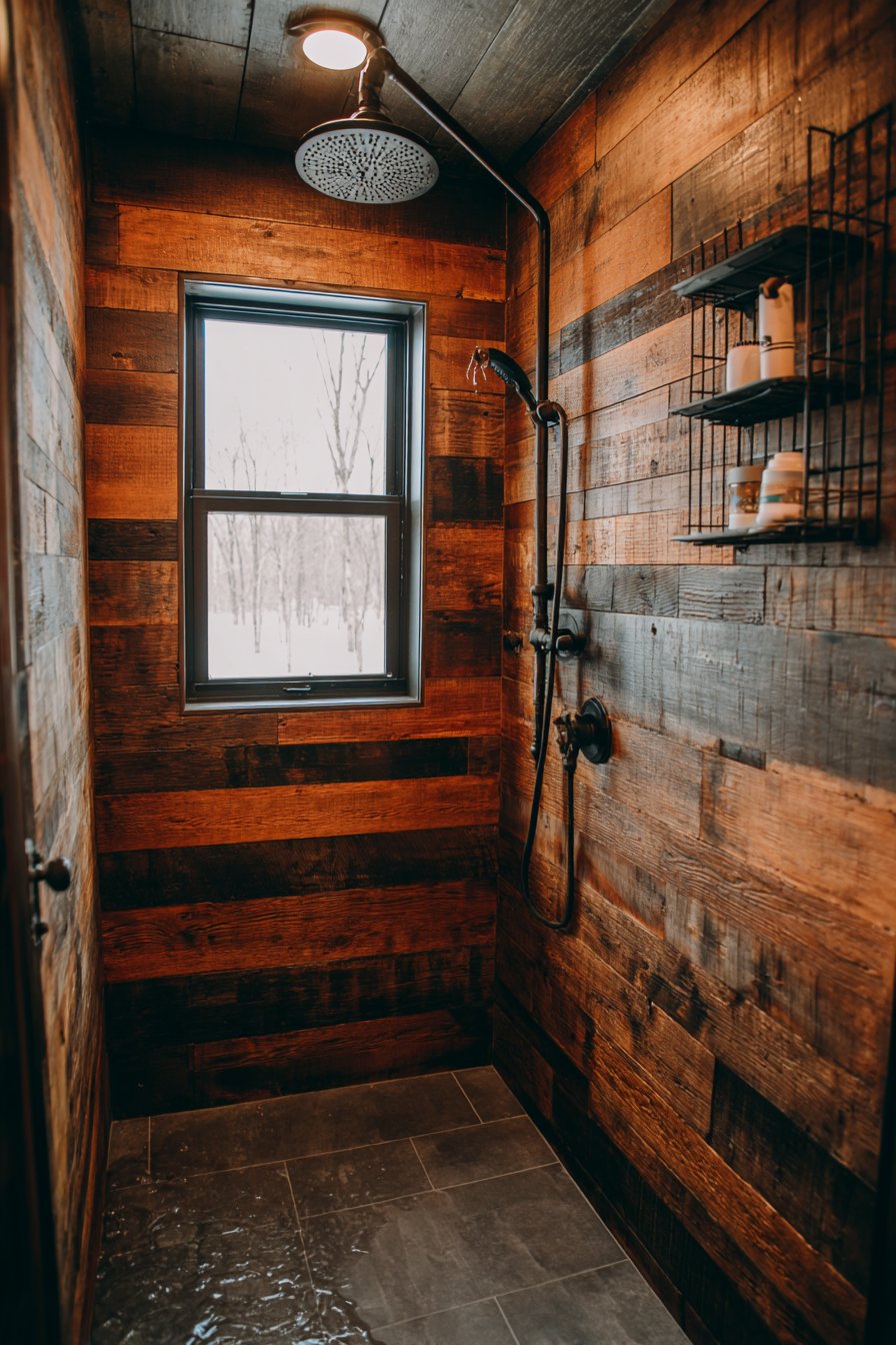 Concrete-look floor tiles in charcoal gray provide subtle texture underfoot while their dark tone creates sophisticated contrast with the lighter wood walls. The tiles’ matte finish prevents slipperiness while their concrete aesthetic reinforces the industrial-rustic fusion established by the exposed pipe fixtures. A small window with simple wooden frame provides essential natural ventilation and daylight, its modest size appropriate to the shower’s compact footprint while the wooden frame echoes the shiplap walls and maintains material consistency.