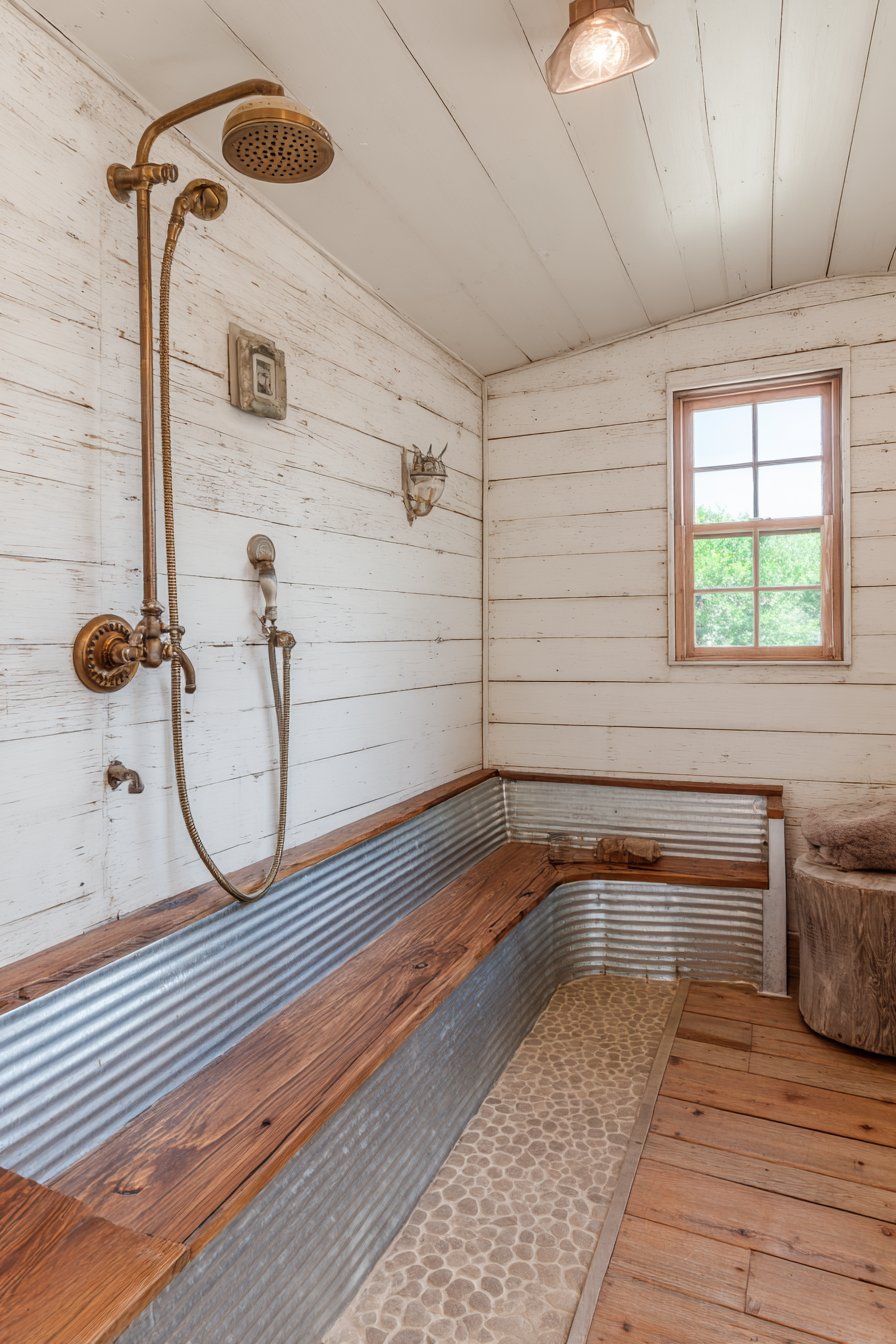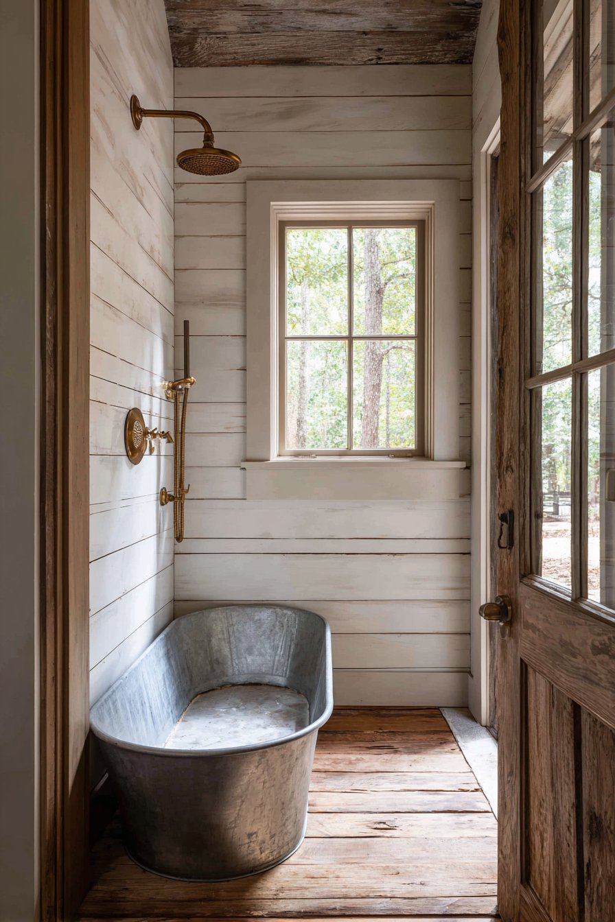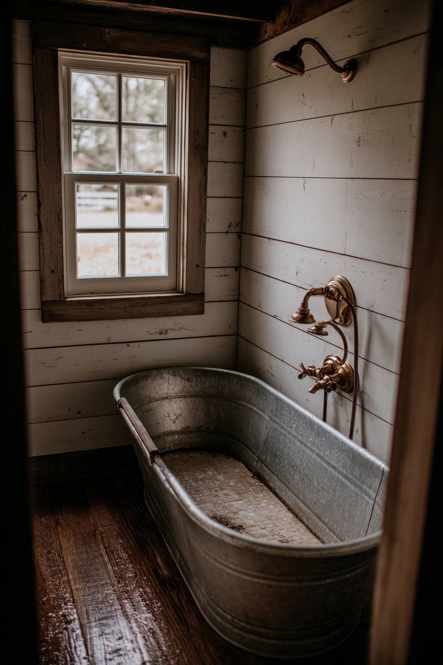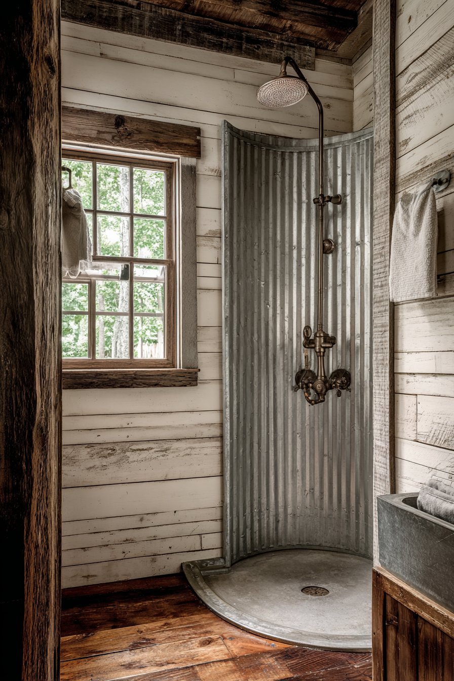 Essential implementation considerations include: working with a licensed plumber to properly install modern drainage systems that comply with building codes while integrating with vintage elements, applying professional waterproofing membranes and sealants specifically designed for metal surfaces, ensuring the trough’s base is properly supported and level to prevent water pooling or drainage issues, treating shiplap walls with appropriate moisture-resistant paints or sealants rated for bathroom use, and installing proper ventilation fans in addition to operable windows to manage humidity effectively. The white painted shiplap should receive multiple coats of moisture-resistant primer and paint specifically formulated for high-humidity environments. This rustic shower idea celebrates resourcefulness and creativity, proving that the most memorable designs often come from thinking outside conventional boundaries.