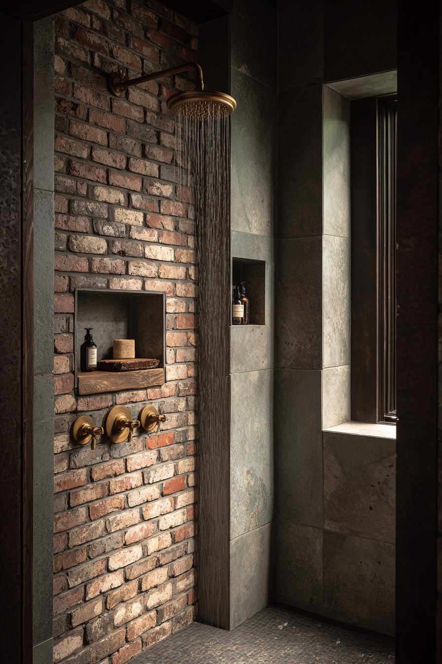 Key design principles for achieving this look include: properly sealing reclaimed brick to prevent moisture absorption while maintaining its authentic appearance, ensuring the brick wall receives professional waterproofing membrane installation behind the brick to protect structural walls from moisture, choosing concrete-look tiles with subtle variation rather than perfectly uniform appearance for more authentic character, installing the reclaimed wood niche during initial construction with proper waterproofing rather than as an afterthought, and selecting grout colors that complement rather than contrast with tile colors for a more sophisticated appearance. The bronze fixtures should be quality reproductions or restored vintage pieces rather than artificially aged new fixtures for authentic patina development. This rustic shower idea demonstrates how seemingly disparate materials can create cohesive, compelling spaces when united by thoughtful design and a consistent color palette.