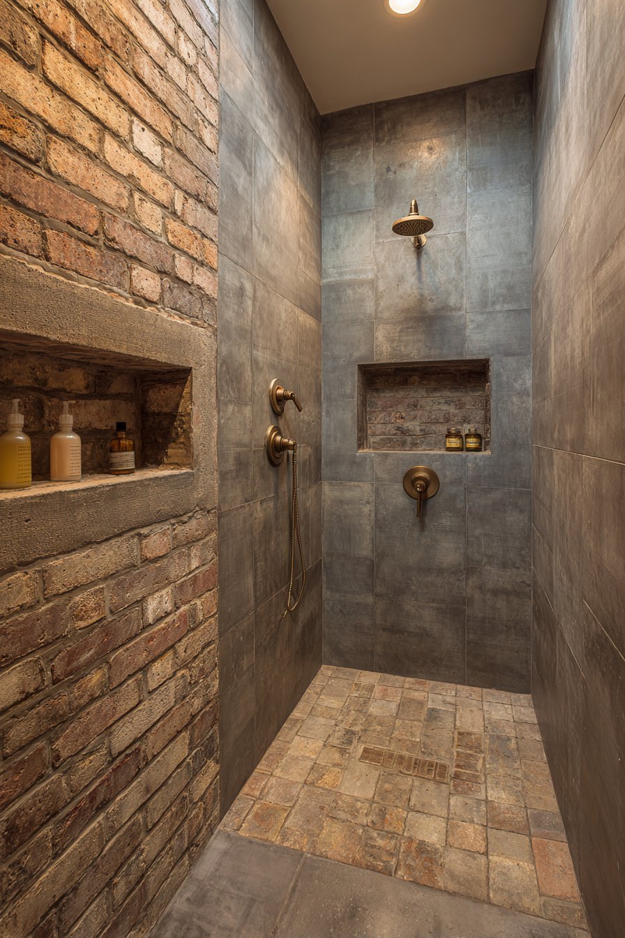 A bronze thermostatic shower system delivers modern performance and convenience within this aesthetically diverse environment. The dual showerheads—typically a fixed rainfall head and an adjustable handheld option—provide flexibility and functionality while their bronze finish creates warmth that bridges the cooler gray tiles and warmer brick tones. The thermostatic controls ensure consistent water temperature regardless of usage elsewhere in the home, representing the perfect marriage of period-appropriate style with contemporary performance. A built-in niche framed with reclaimed wood provides essential storage while introducing another natural material that softens the harder brick and tile surfaces.