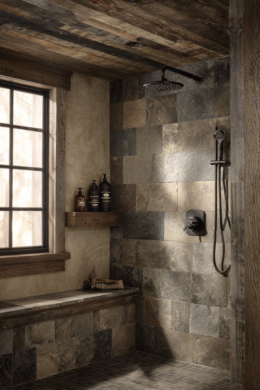 Organic and geometric elements create dynamic tension in this innovative rustic shower idea featuring a live-edge wood shelf integrated directly into the stone tile wall. The shelf retains its natural bark edge and organic shape, celebrating the tree’s original form rather than forcing the wood into geometric conformity. This feature creates a striking focal point that demonstrates nature’s inherent beauty while providing practical storage for shower essentials. The shelf has been carefully sealed and treated for wet environment exposure, protecting it from moisture while maintaining its natural appearance. The surrounding stone tiles display geometric patterns that create intentional contrast with the shelf’s organic forms.
