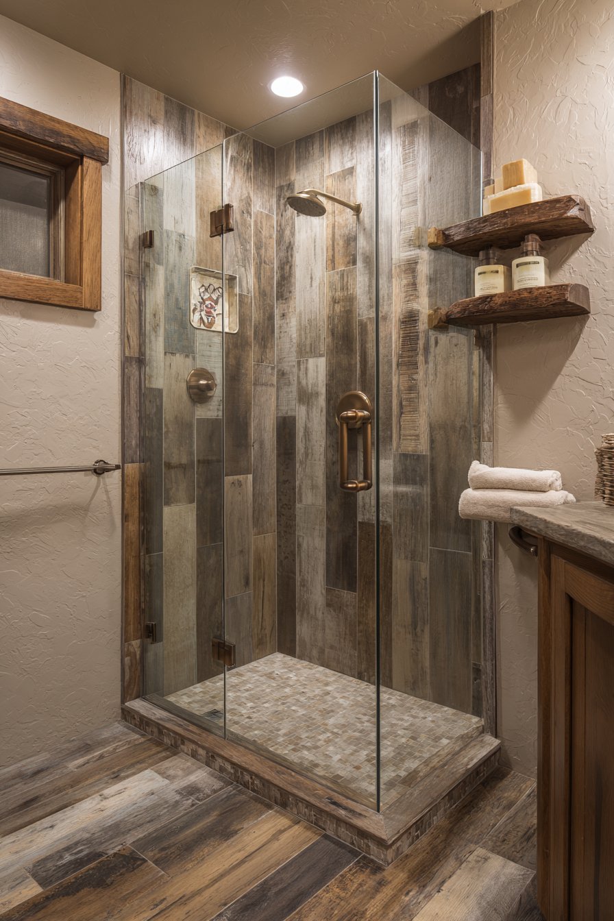 Advanced porcelain technology enables this rustic shower idea, which features floor-to-ceiling barnwood-look tiles that deliver authentic wood appearance with none of wood’s moisture-related challenges. The tiles display varied brown and gray tones with remarkably realistic wood grain texture, creating the warmth and character of reclaimed barn wood while offering porcelain’s superior durability and water resistance. The vertical plank installation emphasizes ceiling height while the varied tones prevent monotony. A frameless glass door and panel maintain clean sight lines and maximize the sense of openness while keeping water contained—the transparency allows the beautiful tile work to remain visible even when showering.