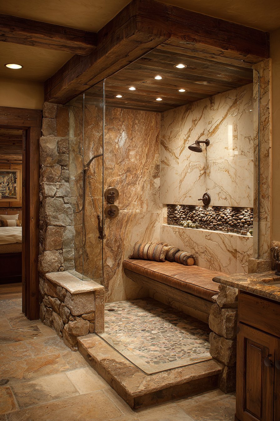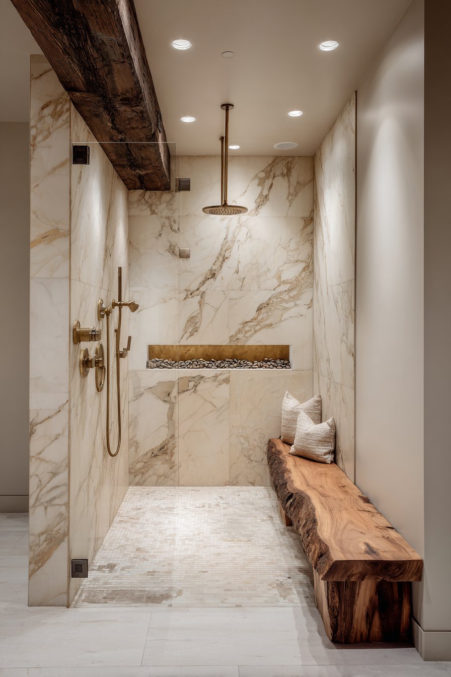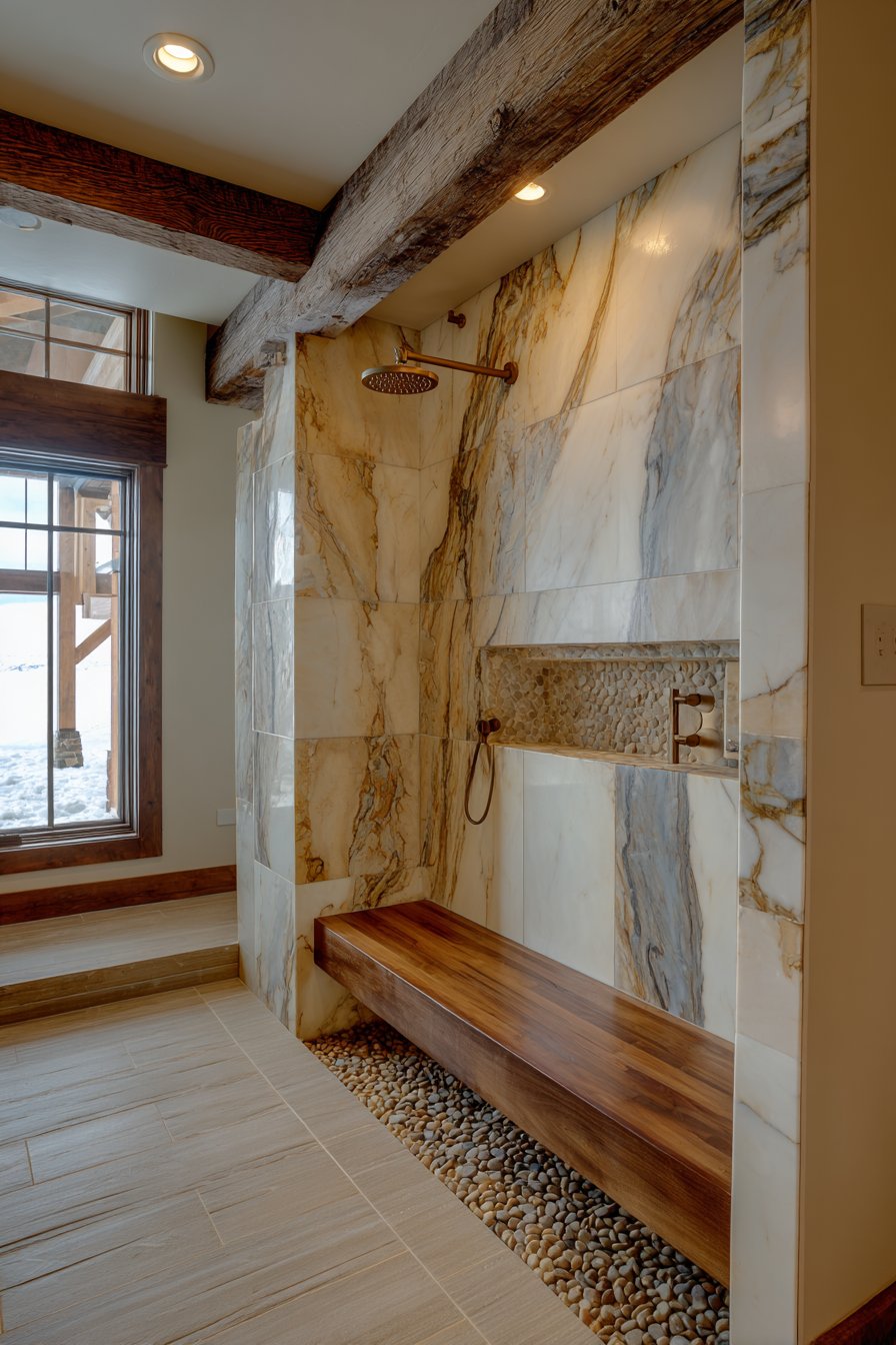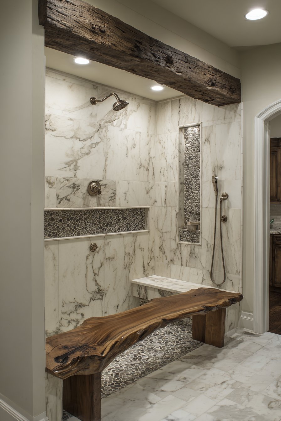 Luxury materials meet rustic sensibility in this sophisticated shower design that demonstrates how rustic shower ideas can embrace elegance without abandoning natural character. Book-matched marble slabs in warm cream tones feature distinctive natural veining that creates organic artwork across the walls, each slab carefully selected and positioned to create symmetrical patterns that emphasize the stone’s natural beauty. A rustic wood beam accent intersects the marble, its rough-hewn texture and natural edge providing earthy contrast to the marble’s polished refinement. This unexpected pairing creates visual interest and prevents the space from feeling too formal or cold.