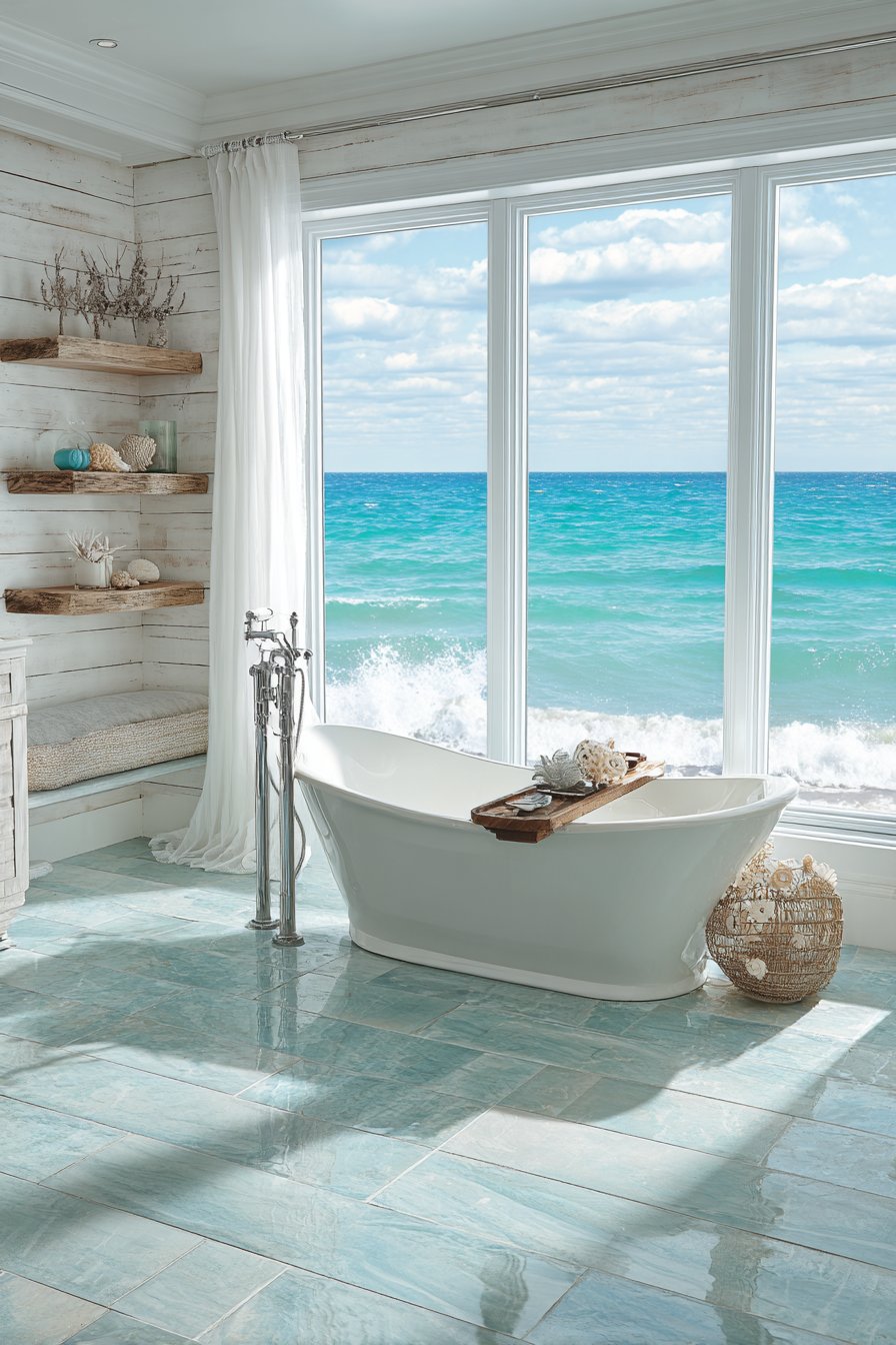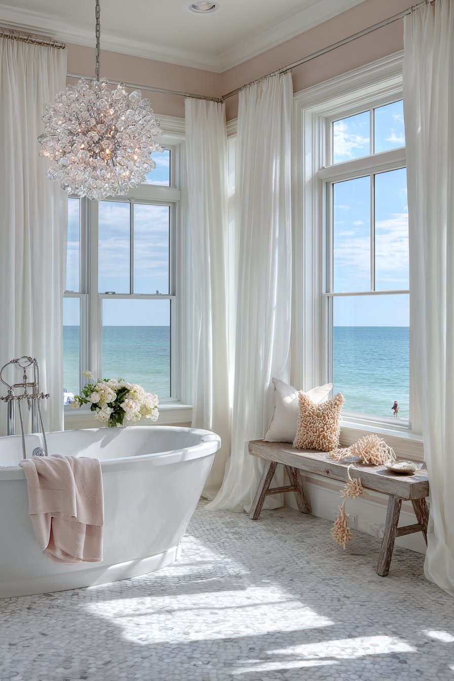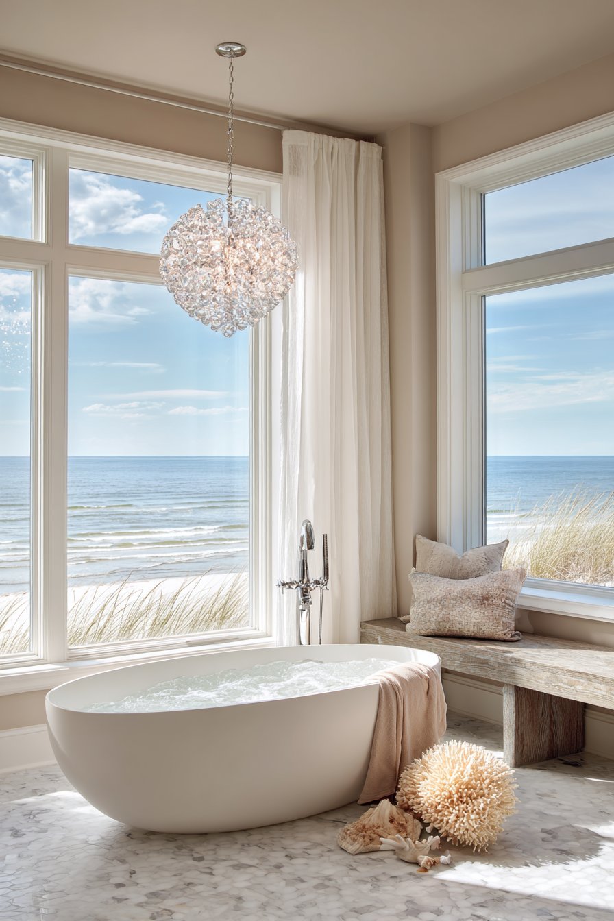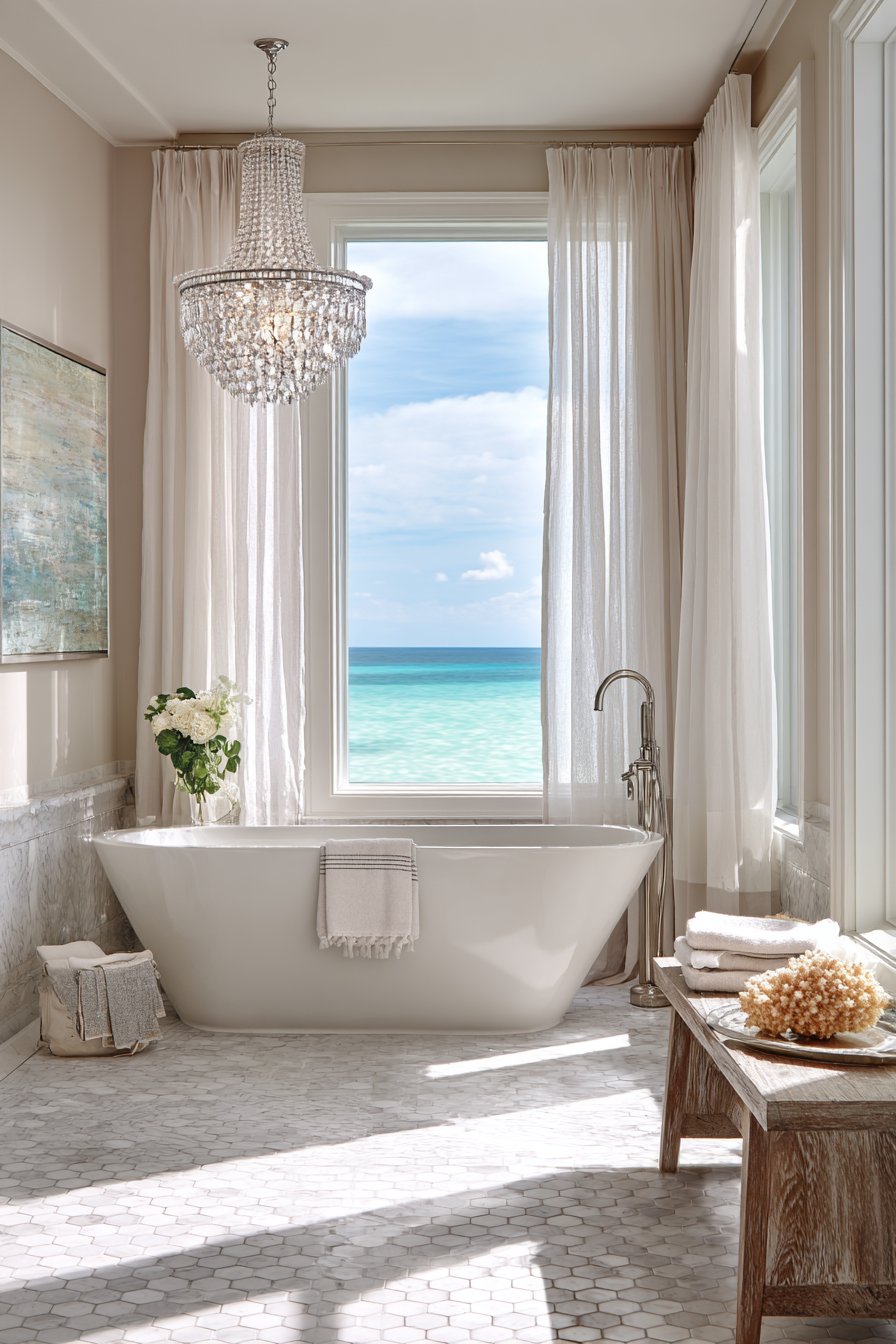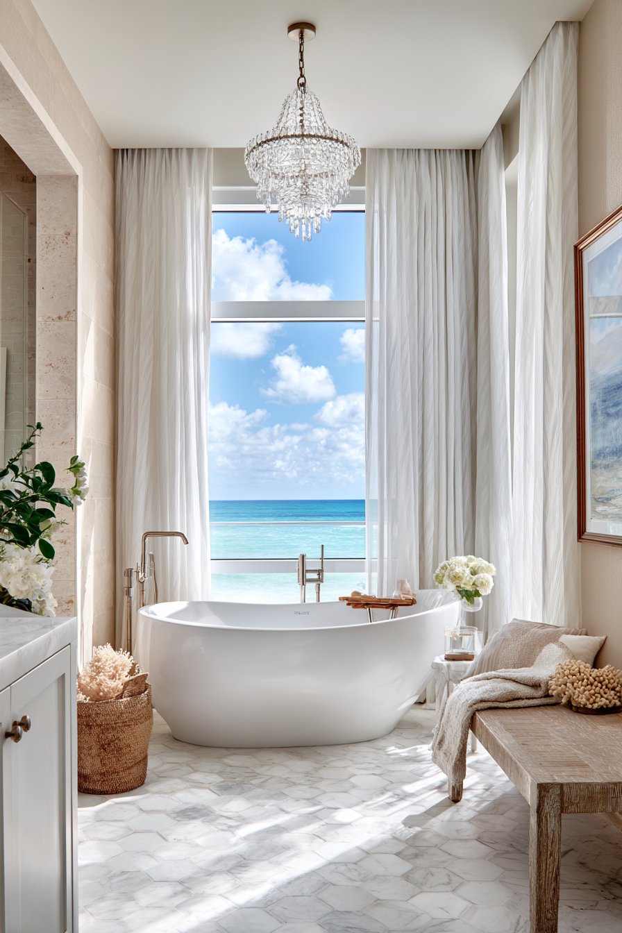Ultimate coastal luxury defines this spectacular bathroom where a freestanding soaking tub with floor-mounted tub filler occupies center stage on white marble hexagonal floor tiles. Floor-to-ceiling windows frame actual ocean views or, in inland settings, lush garden vistas that suggest natural beauty beyond the walls. Sheer white drapery diffuses direct sunlight while preserving the views, their gentle movement adding kinetic beauty. Walls in soft sand beige create a warm neutral backdrop that enhances rather than competes with the views. A weathered wood bench holds plush towels and natural sea sponge, while an unexpected crystal chandelier adds glamorous contrast.