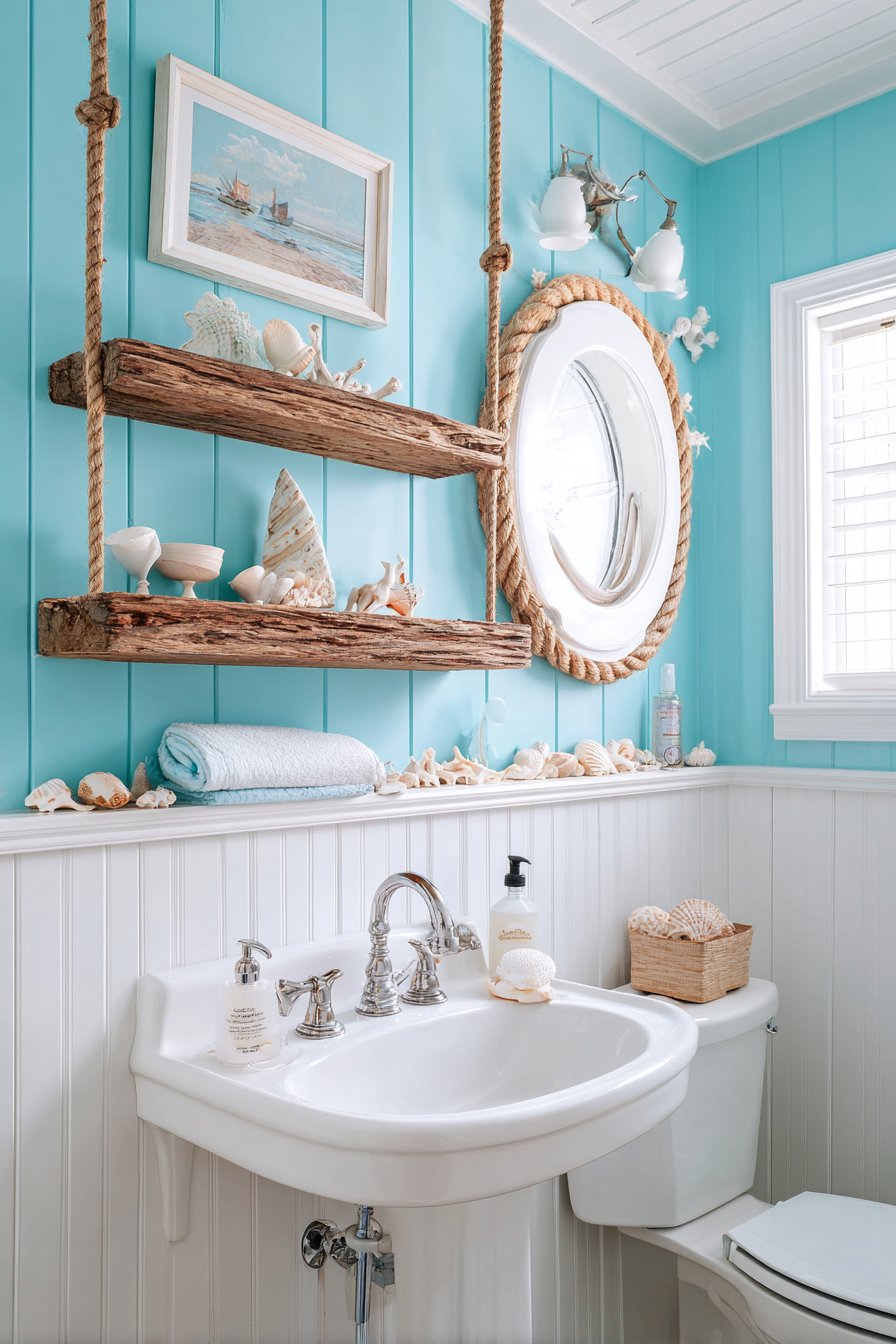 The genius of this design lies in its masterful use of vertical space and layered textures. Floating driftwood shelves display seashell collections and coastal accessories, their weathered appearance providing visual interest against the clean backdrop of white and aqua. The beadboard wainscoting adds dimensional texture while protecting walls from moisture—a practical consideration that enhances rather than compromises aesthetic appeal. Natural light plays a crucial role, streaming through the porthole window to create shifting patterns that evoke the play of sunlight on water.