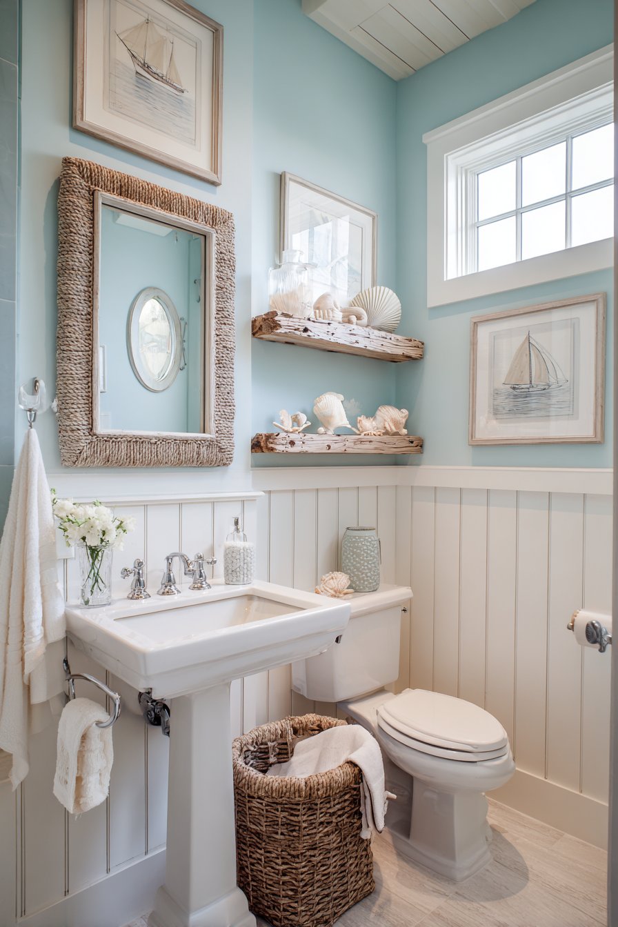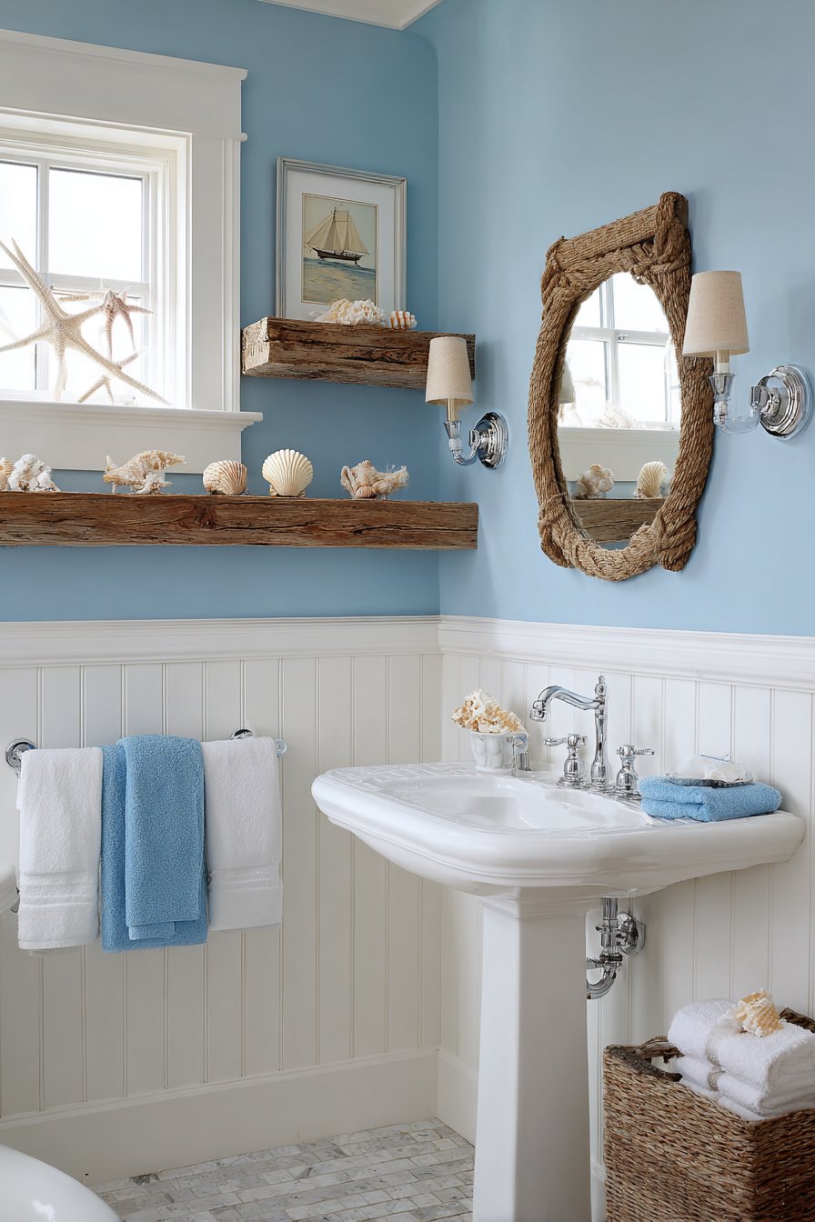 Step into a bathroom that captures the quintessential charm of seaside New England, where crisp white beadboard wainscoting meets soft aqua blue walls in a timeless coastal composition. This design exemplifies the marriage of traditional craftsmanship and coastal aesthetics, featuring a vintage-style pedestal sink with polished nickel fixtures that serves as both a functional centerpiece and a nod to classic bathroom design. The authentic nautical character emerges through carefully curated details: a natural rope mirror frame that adds organic texture, maritime-themed artwork that tells coastal stories, and a small porthole-style window that filters gentle sunlight into the space.
