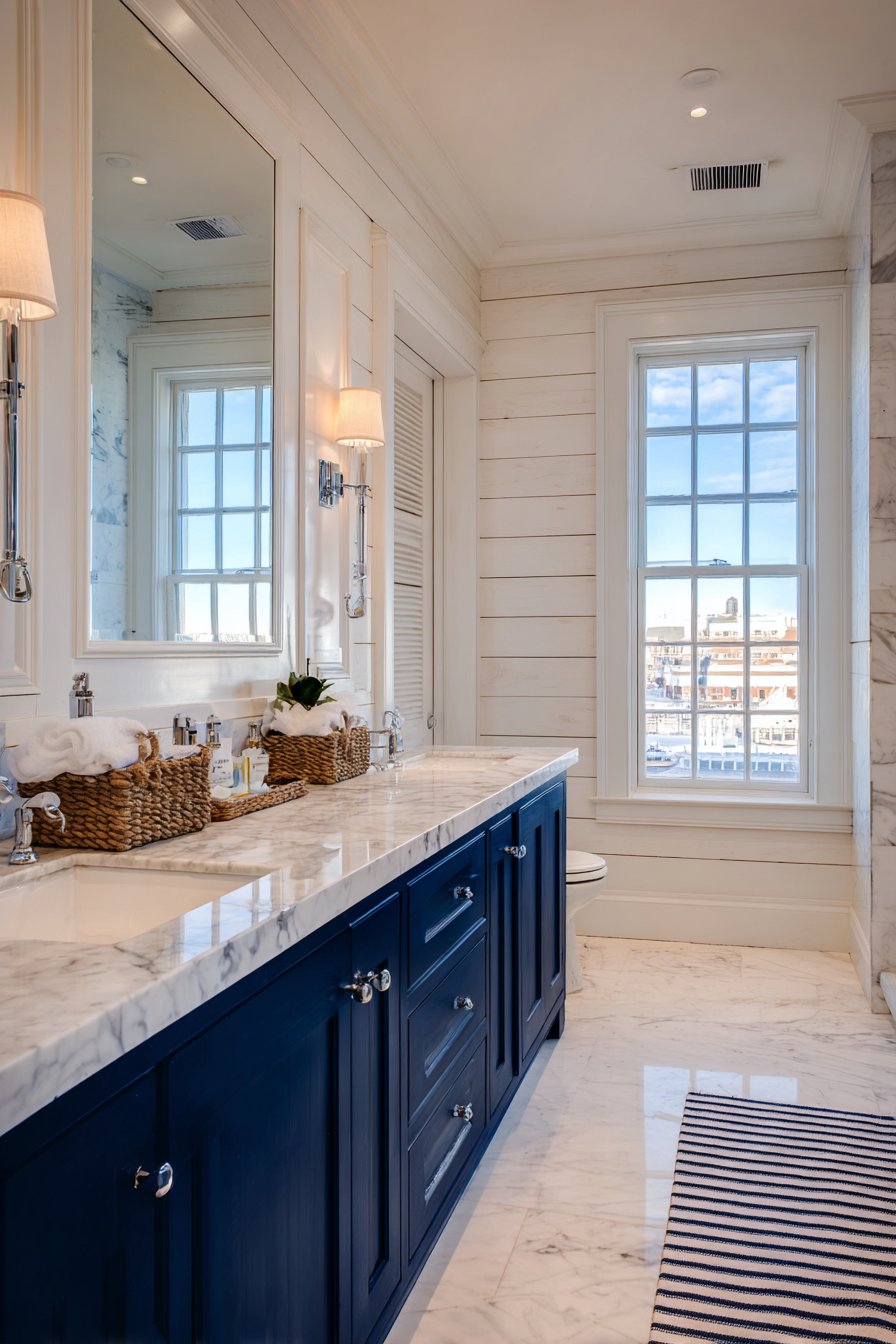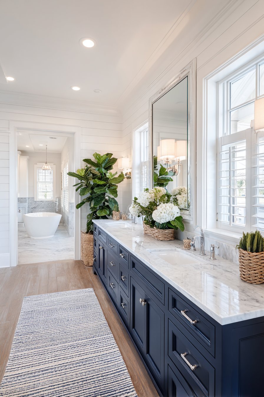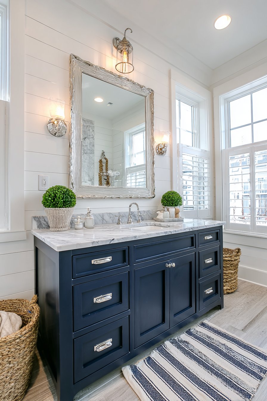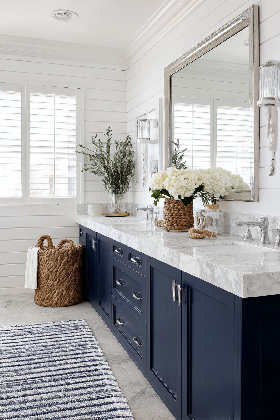 Bold contrast defines this bright seaside bathroom where pristine white shiplap walls create an expansive backdrop for dramatic navy blue vanity cabinetry. The navy cabinets make a confident statement, their deep saturated color anchoring the space and preventing the abundance of white from feeling sterile or institutional. Marble countertop with subtle gray veining introduces natural pattern and luxurious tactile quality, its cool elegance balancing the navy’s richness. Polished chrome fixtures and a large frameless mirror work in concert to reflect natural light streaming from double windows dressed with classic white plantation shutters.