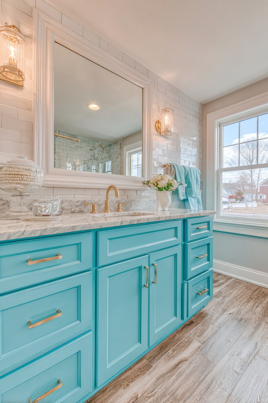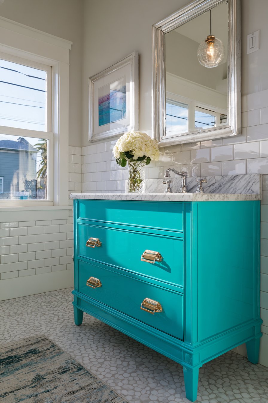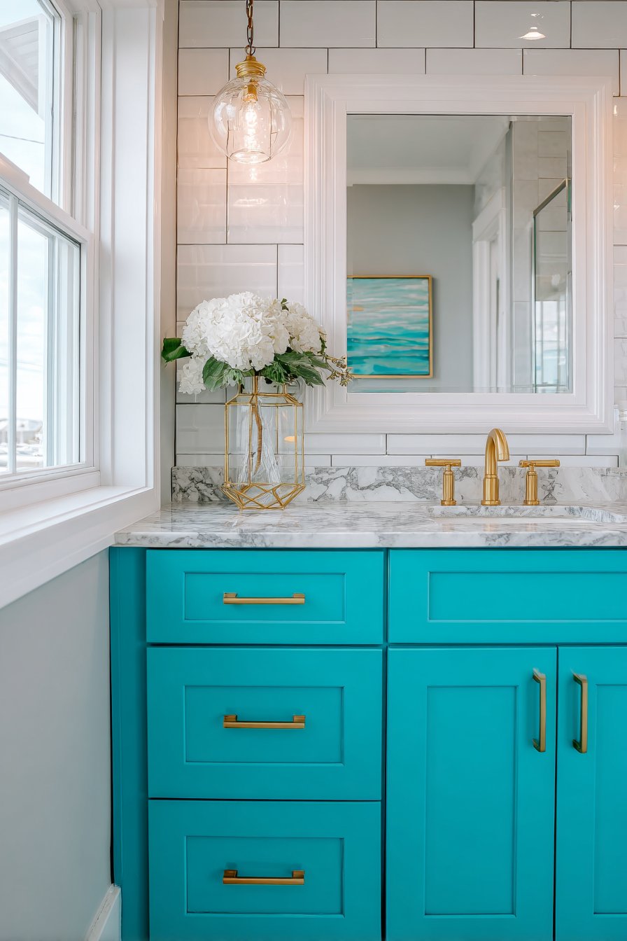 - Paint vanity in bold turquoise to create an energetic coastal focal point