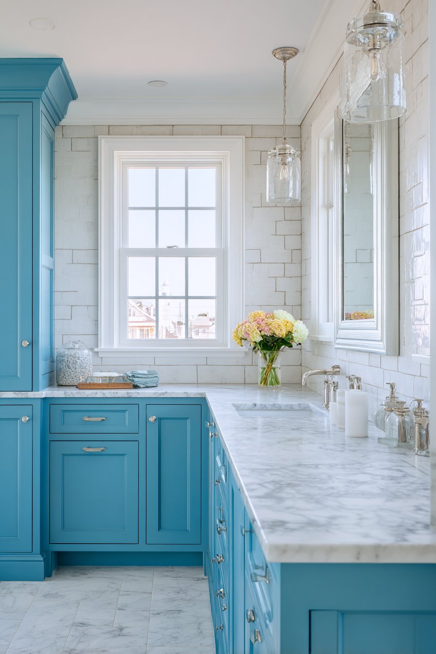 - Pair turquoise cabinetry with white marble countertop for elegant contrast