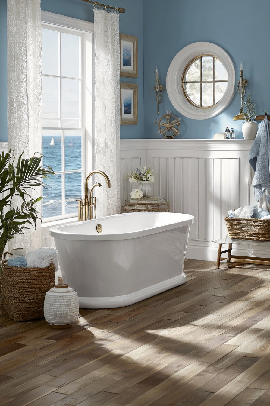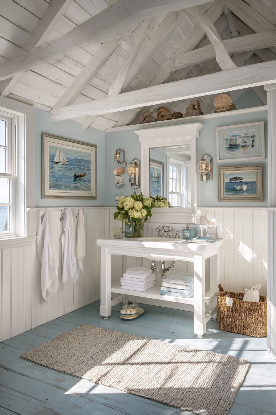 The versatility demonstrated across these twenty-one designs proves that coastal style adapts to virtually any bathroom size, budget level, or regional context. Compact powder rooms make bold statements with navy vanities and porthole mirrors, while expansive master bathrooms embrace luxury through freestanding tubs and marble surfaces. Budget-conscious designs achieve authentic coastal character through painted furniture conversions and creative use of affordable materials like subway tiles, while high-end concepts incorporate premium materials like Carrara marble and teak. This adaptability ensures that anyone drawn to coastal aesthetics can find approaches suitable to their specific circumstances.