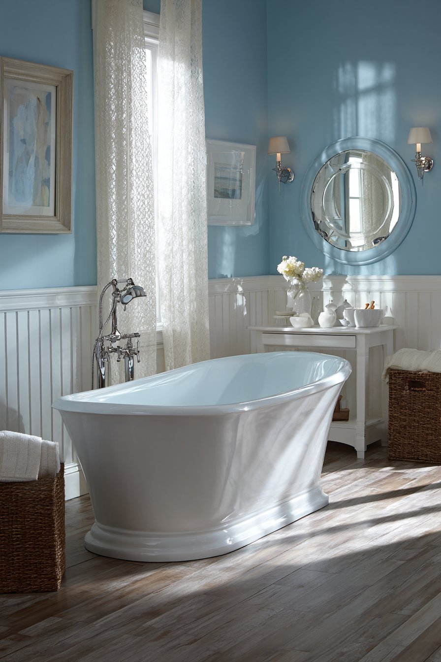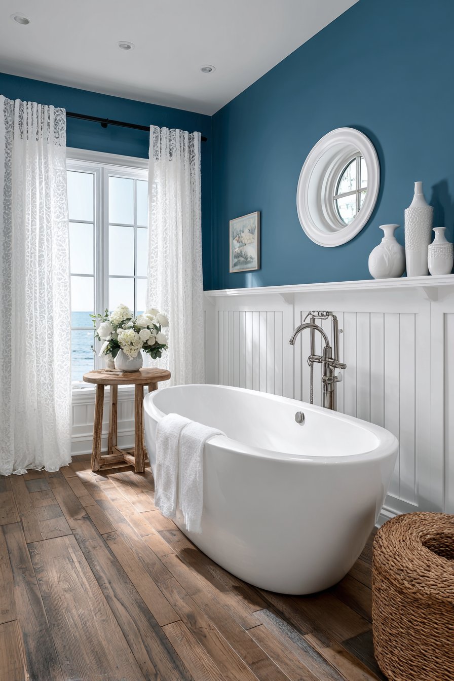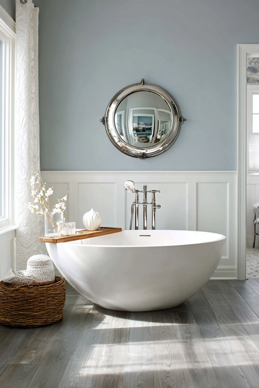 Depth and drama characterize this refined seaside bathroom where gray-blue walls reminiscent of stormy seas create a moody, sophisticated atmosphere. The color selection moves beyond typical coastal pastels to embrace the ocean’s more complex personality—the deep tones seen when storm clouds gather over water. White wainscoting provides crisp contrast and prevents the darker walls from overwhelming the space, its traditional profile adding architectural polish. A freestanding oval bathtub in glossy white finish serves as the luminous centerpiece, its sculptural form standing out beautifully against the complex wall color.