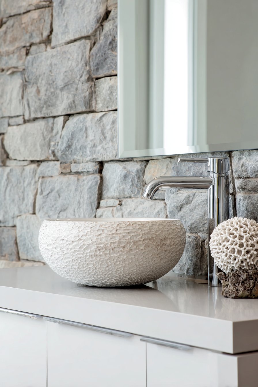 - Use natural stone floor tiles in mixed tones to echo beach pebbles and ground the design