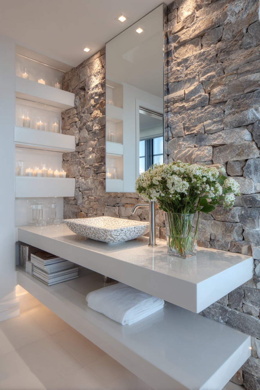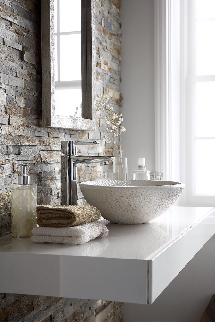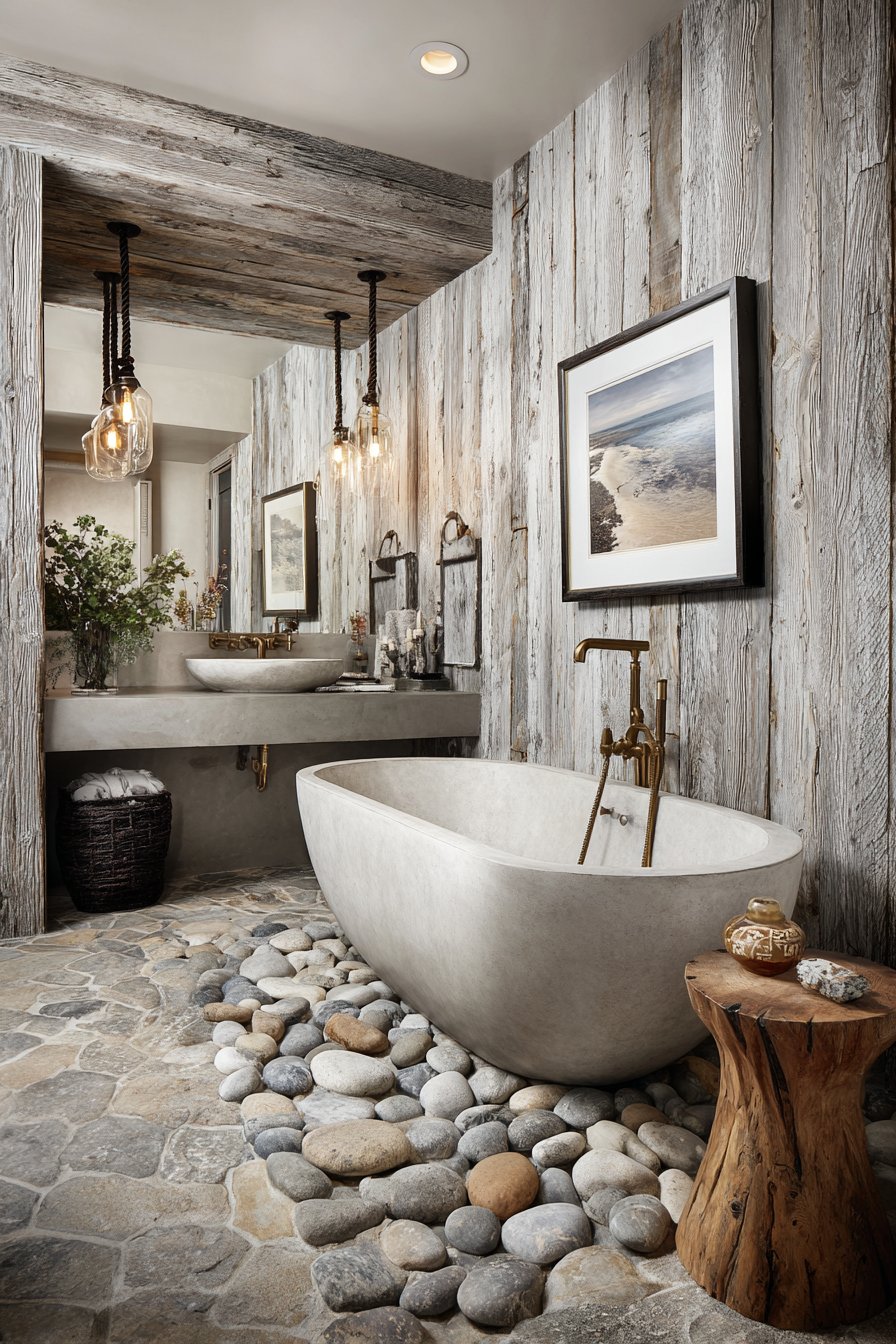 - Pair a modern freestanding tub with rustic elements for dynamic contrast