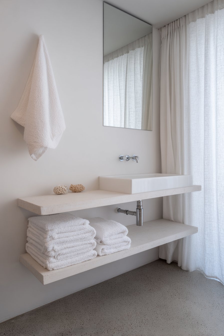 The bamboo elements represent sustainable material choices that align with coastal environmental consciousness. Bamboo grows rapidly, requires minimal pesticides, and regenerates without replanting—making it one of the most sustainable building materials available. The bamboo ladder provides vertical storage that maximizes wall space, perfect for hanging towels or displaying accessories. Its natural finish and organic form soften the bathroom’s hard surfaces, introducing curves and natural variation to counter the predominance of straight lines and manufactured materials.