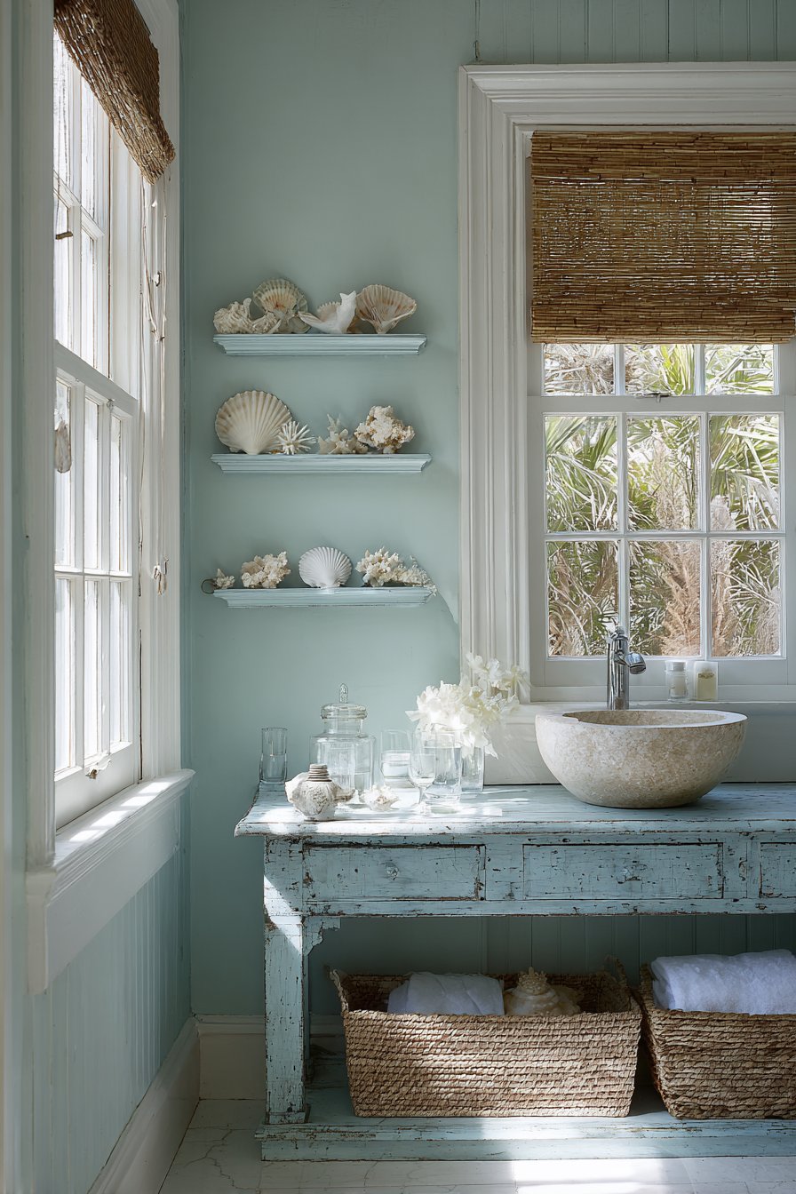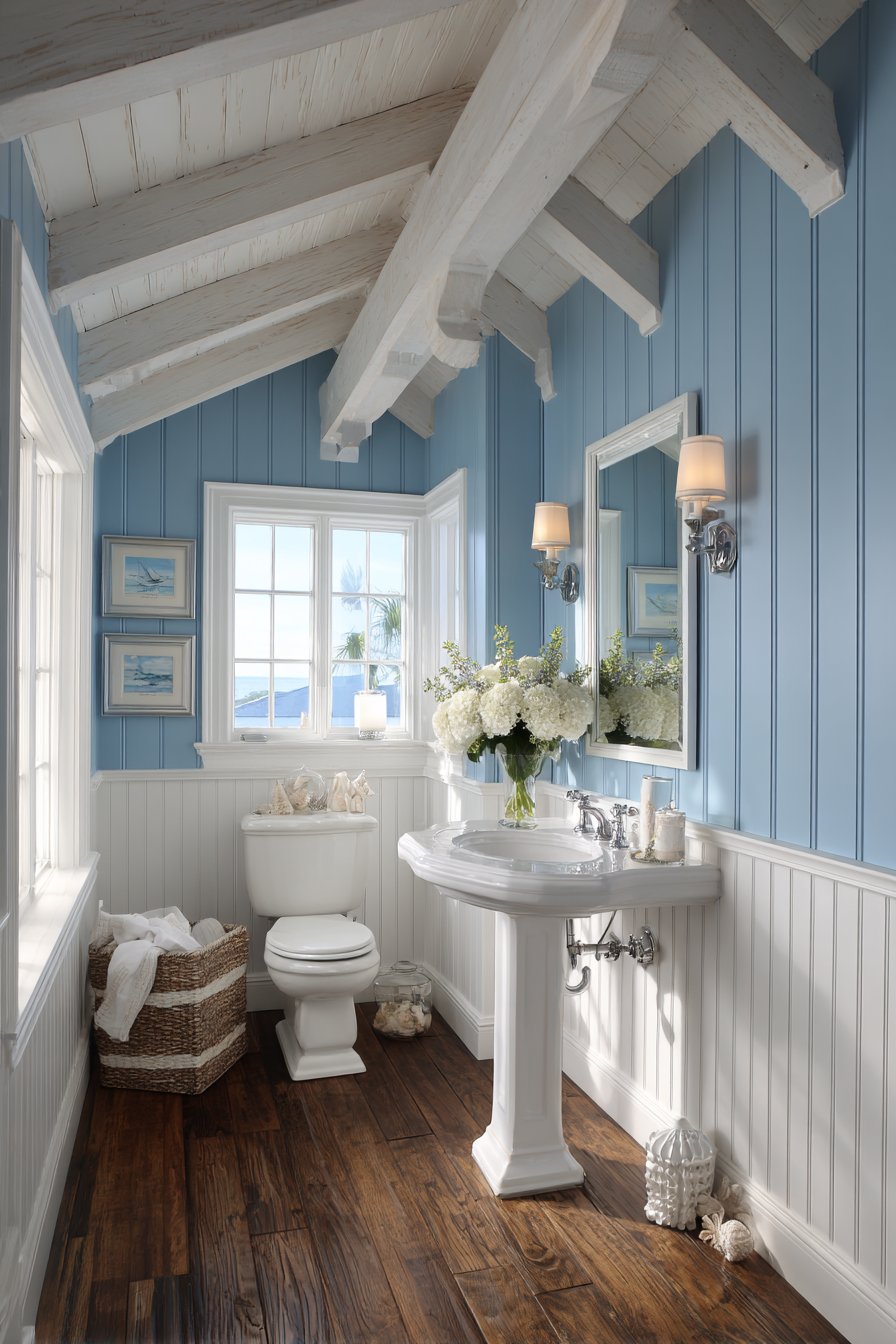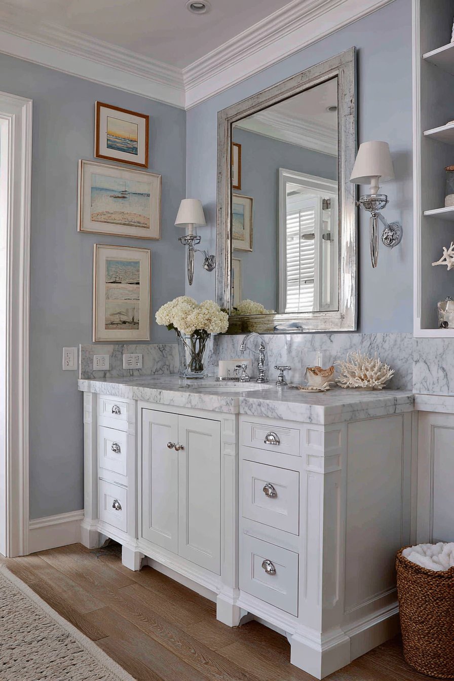 - Paint walls in pale blue-gray for sophisticated coastal atmosphere
