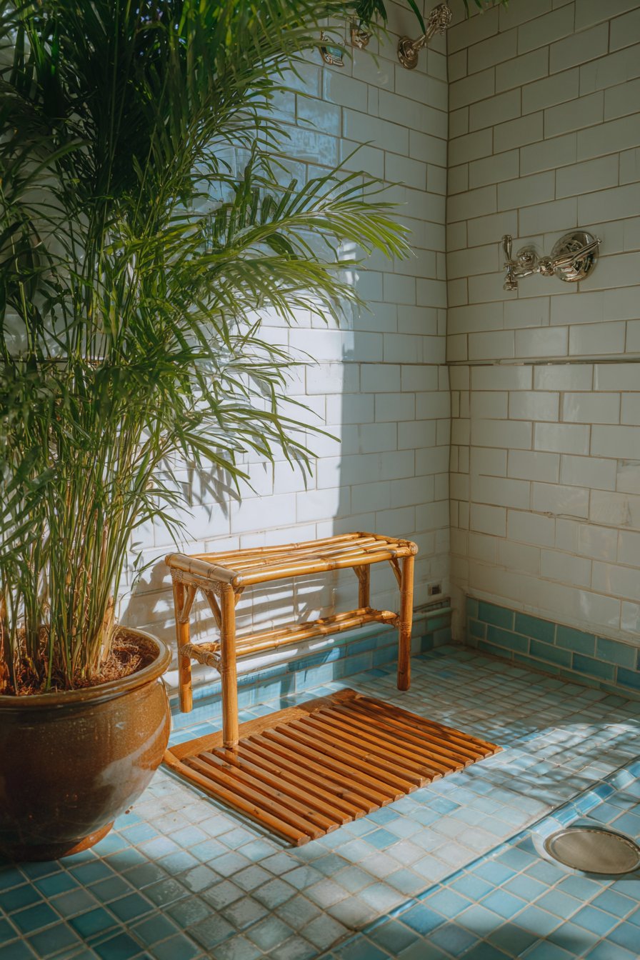 The walk-in shower demonstrates how subtle color introduction through border tiles creates impact without commitment. The sea glass blue border tiles add personality and coastal reference while the white subway tiles maintain timeless versatility. If the homeowner tires of the blue accent, changing border tiles is far simpler than repainting an entire room. The teak shower mat introduces luxury underfoot while its slatted design promotes drainage and prevents slipping. The potted palm brings life and air-purifying benefits, its tropical foliage reinforcing the resort atmosphere.
