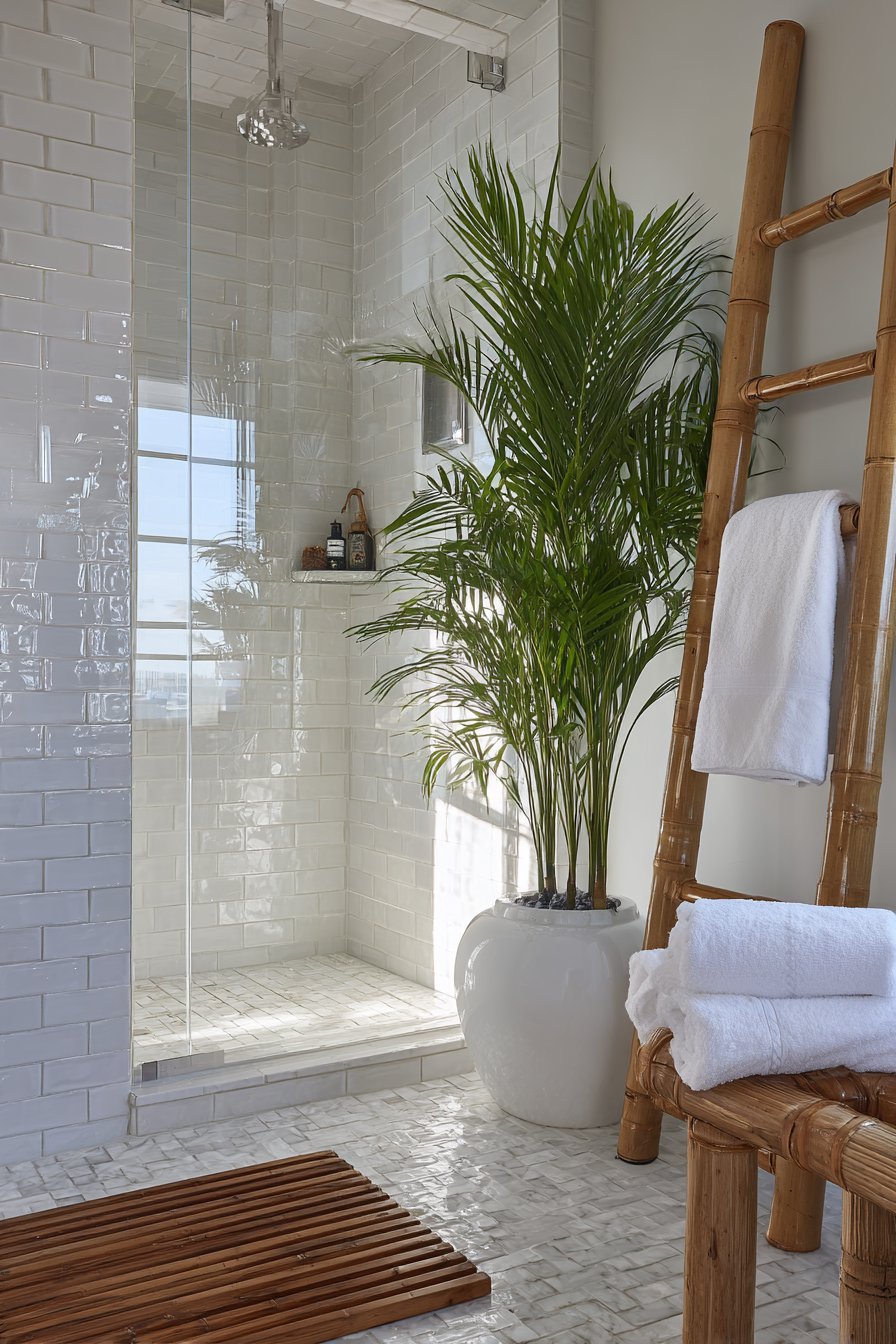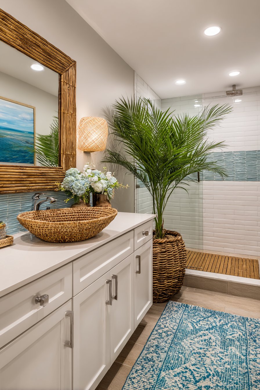 Warm climate coastal living inspires this tropical seaside bathroom where bamboo accents bring organic warmth and sustainable style. White walls create a bright, fresh backdrop while natural bamboo elements—mirror frame, storage ladder, and accessories—introduce the relaxed elegance associated with resort destinations. A walk-in shower features classic white subway tiles with sea glass blue border tiles that add color without overwhelming the clean aesthetic. A teak shower mat and accessories provide rich wood tones and practical functionality, while a potted palm adds lush greenery. Chrome fixtures maintain a fresh, clean appearance.
