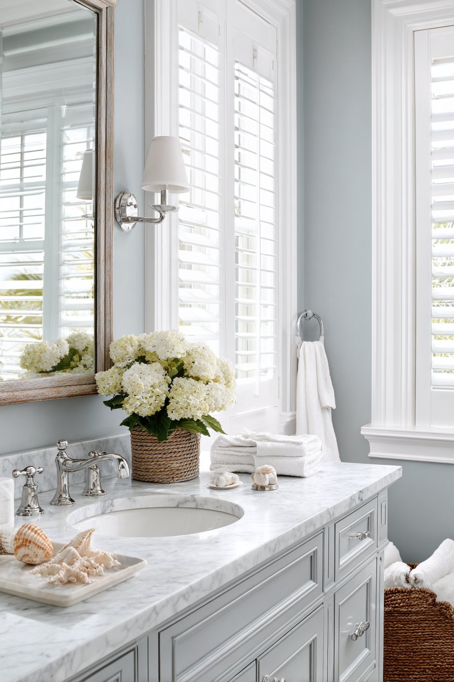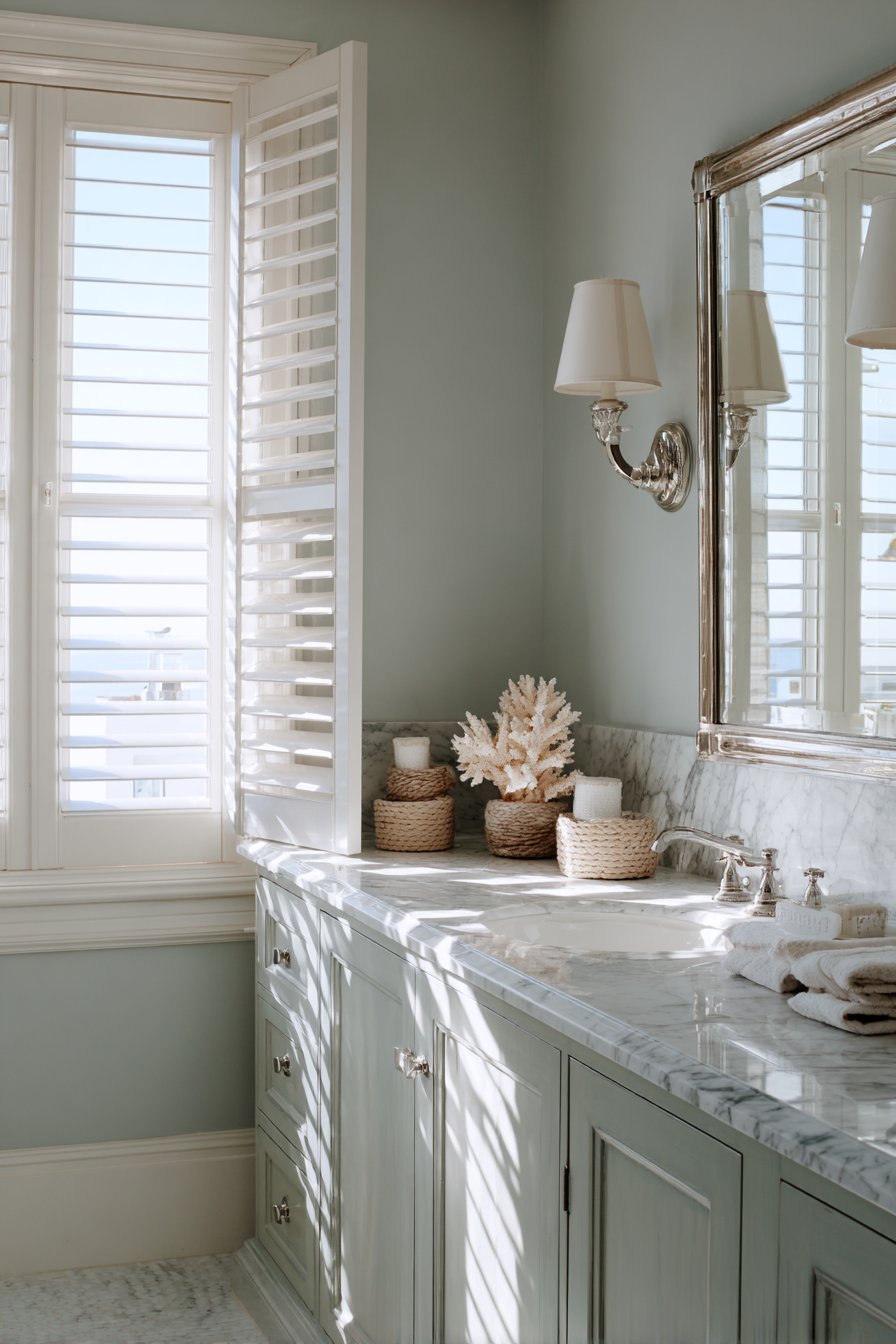 Pale blue-gray walls create a sophisticated coastal ambiance that moves beyond obvious beach references to suggest more subtle connections—morning mist over water, weathered beach fences, or distant horizons. White plantation shutters provide light control and privacy while enhancing the room’s traditional character. Subtle coastal touches like rope-wrapped soap dispensers and coral specimens add seaside references without overwhelming the refined aesthetic. This bathroom proves that coastal design can be thoroughly sophisticated, foregoing obvious nautical motifs for a more nuanced interpretation of seaside elegance.