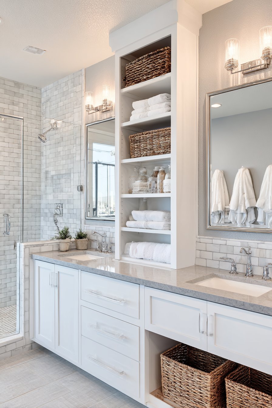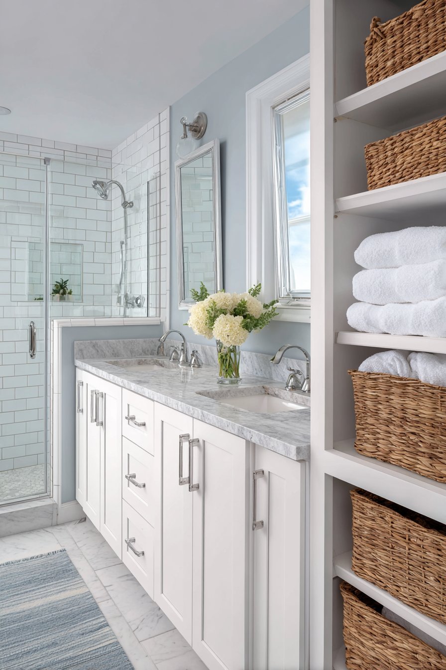 This well-planned master bathroom demonstrates how efficient design and coastal style unite to create spaces that serve real daily needs while maintaining aesthetic appeal. A double vanity with white shaker-style cabinetry and gray quartz countertop provides ample preparation space for two users, while polished chrome faucets and simple rectangular mirrors deliver straightforward functionality. The white subway tile shower surround with clear glass enclosure maximizes light penetration, while coastal blue-gray walls create a calming environment. A built-in linen closet with glass-front doors displays neatly organized white towels and woven baskets.
