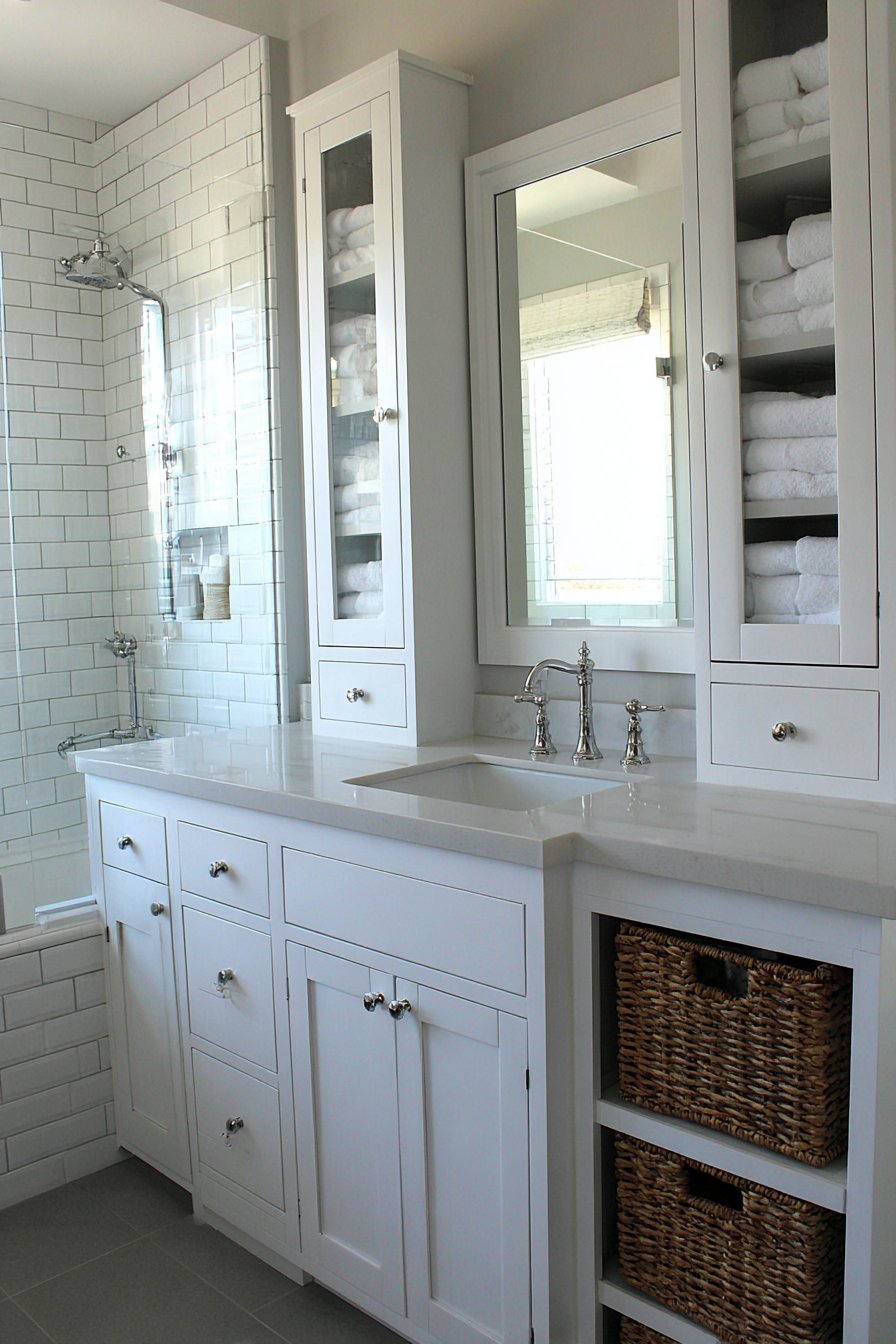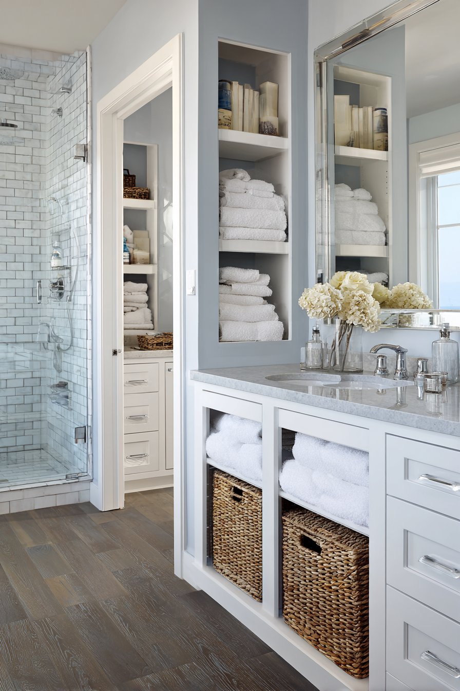The built-in linen closet with glass-front doors demonstrates how storage can be both functional and decorative. The glass fronts require organization discipline—only attractive, neatly arranged items should be displayed—but this accountability often leads to better habits and more pleasant spaces. The combination of visible storage for towels and concealed storage in woven baskets provides flexibility for displaying attractive items while hiding necessities. The coastal blue-gray walls create a serene atmosphere without introducing bold colors that might tire over time in a frequently used master bath.