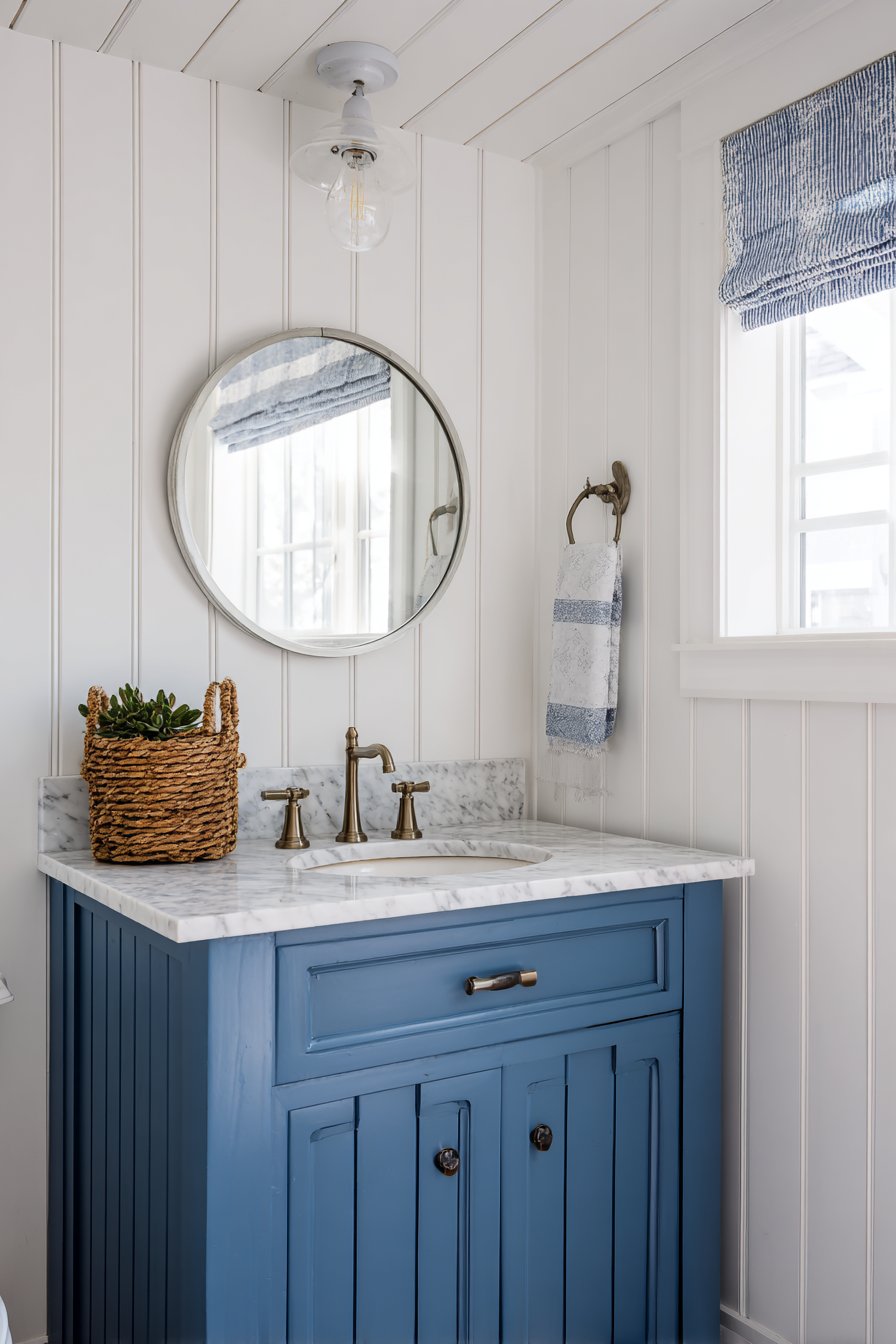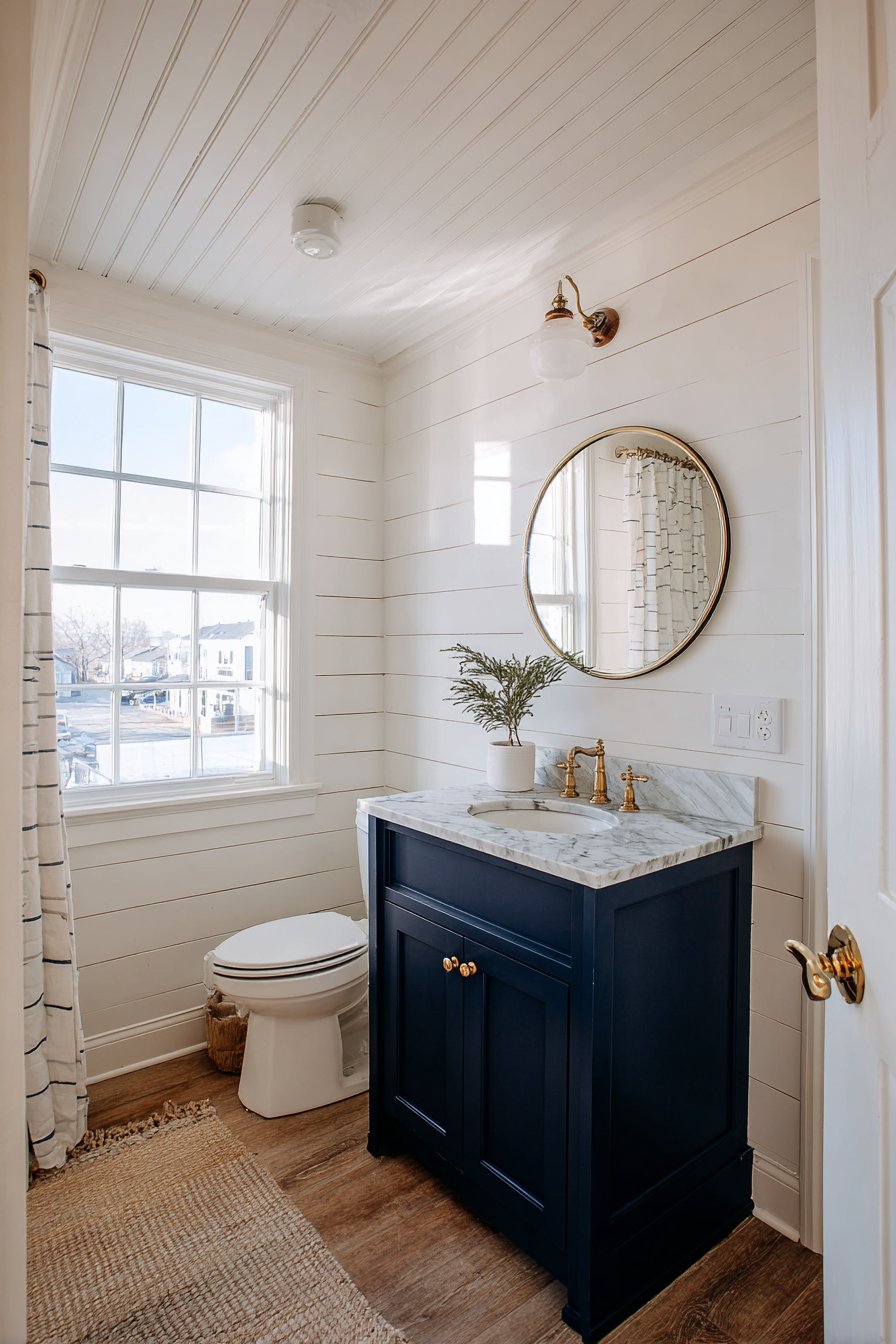 This cozy powder room proves that small spaces can make big style statements when designed with intention and confidence. White shiplap walls create classic coastal texture while a statement navy blue vanity with marble top commands attention in the intimate space. A brass faucet and cabinet hardware add warmth and vintage character, while a round porthole mirror reinforces the maritime theme without feeling kitschy. White beadboard ceiling and a simple pendant light fixture complete the carefully composed small space. A small window with cafe curtain provides privacy while allowing natural light.